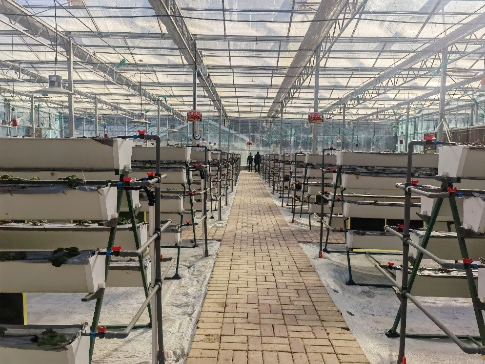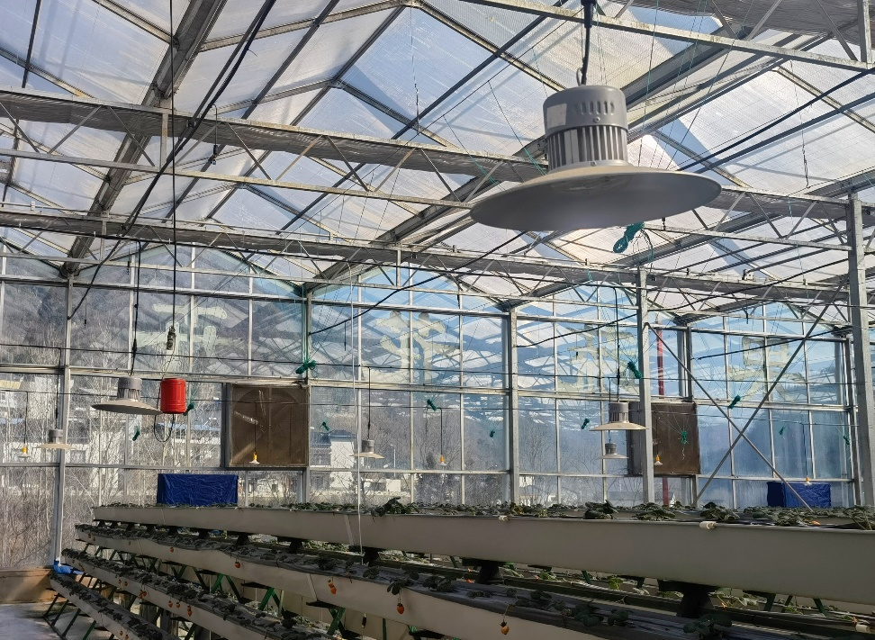 草莓种植架上方的这些圆形吊灯,可不是普通的照明灯。作为专业的农业补光灯,它们也是这座大棚不可或缺的“智慧分子”。