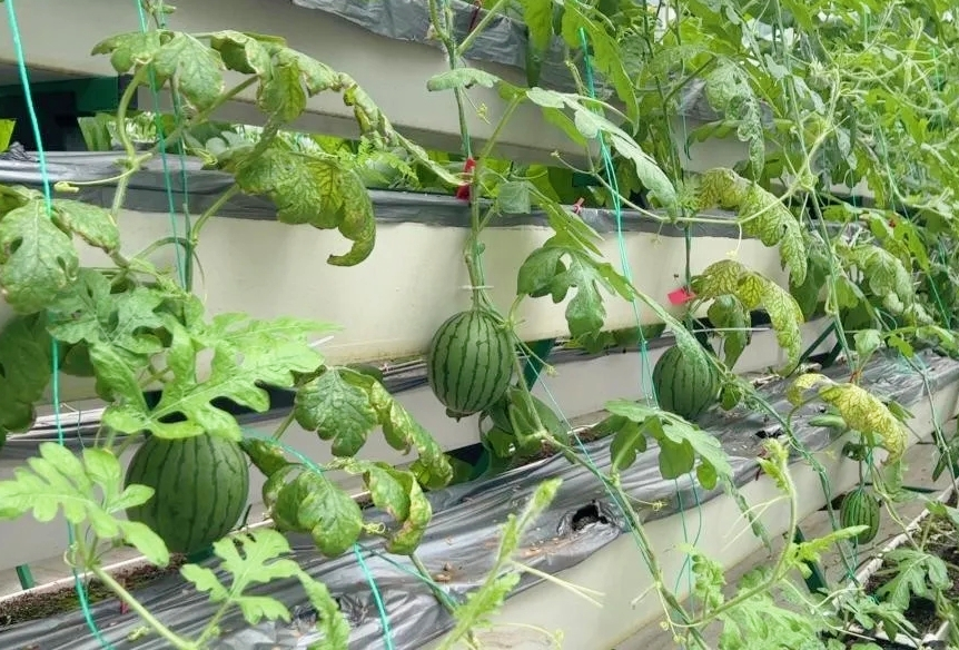 “大棚里所有的植物都是基质栽培。一般土壤若不经过改良,要么容易板结,要么过于疏松,保水保肥效果不好。基质则规避掉了土壤的短板,能促进植物营养均匀吸收,利于精耕细作、防旱保墒。”