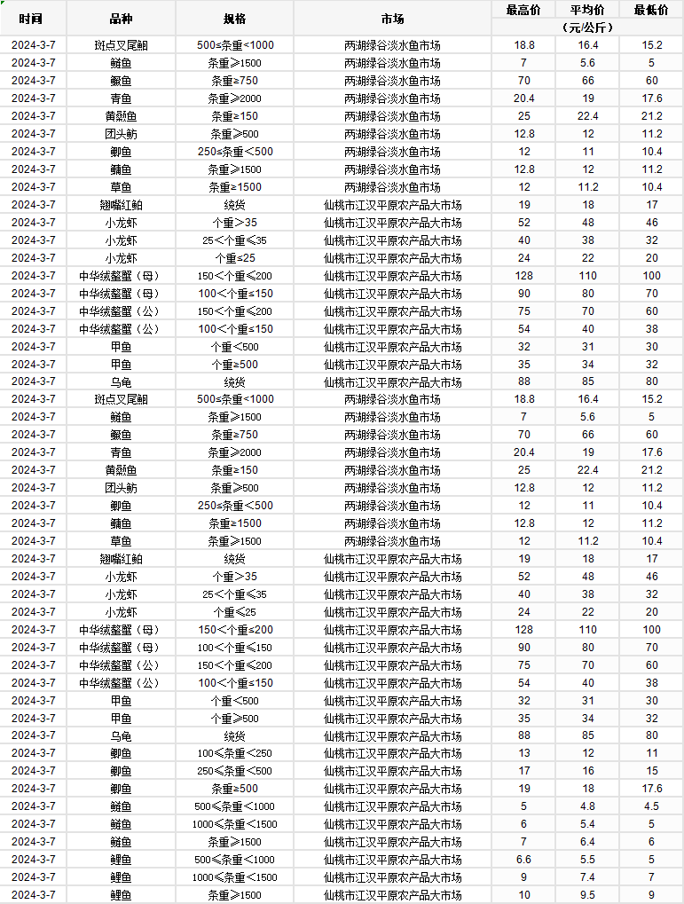 2024年3月7日 行情|湖北省主要水产品价格明细
