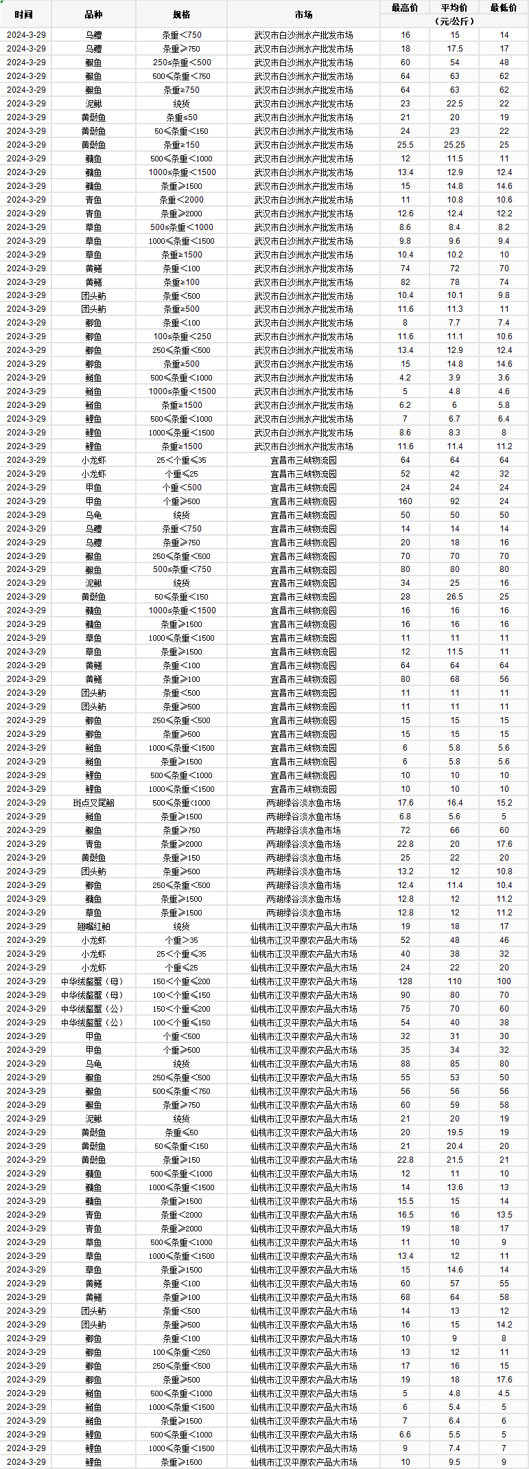 2024年3月29日 行情|湖北省主要水产品价格明细