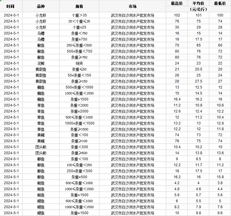 2024年5月1日 行情|湖北省主要水产品价格明细