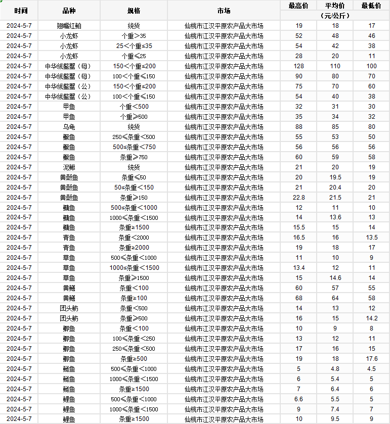 2024年5月7日 行情|湖北省主要水产品价格明细