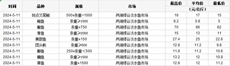 说明:以上各行情来源于“湖北省水产品批发市场信息采集分析平台“,经湖北省渔业科技超市授权发布。