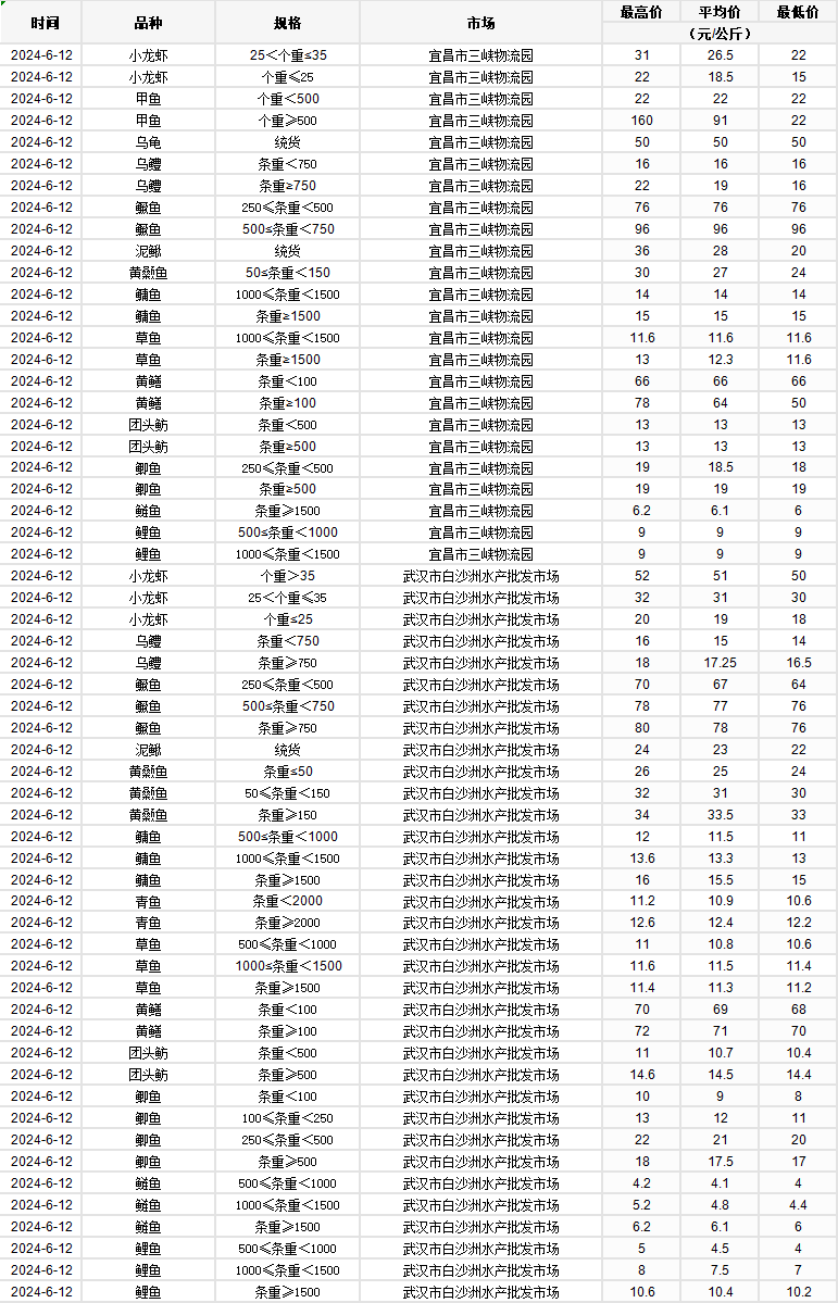 2024年6月12日 行情|湖北省主要水产品价格明细