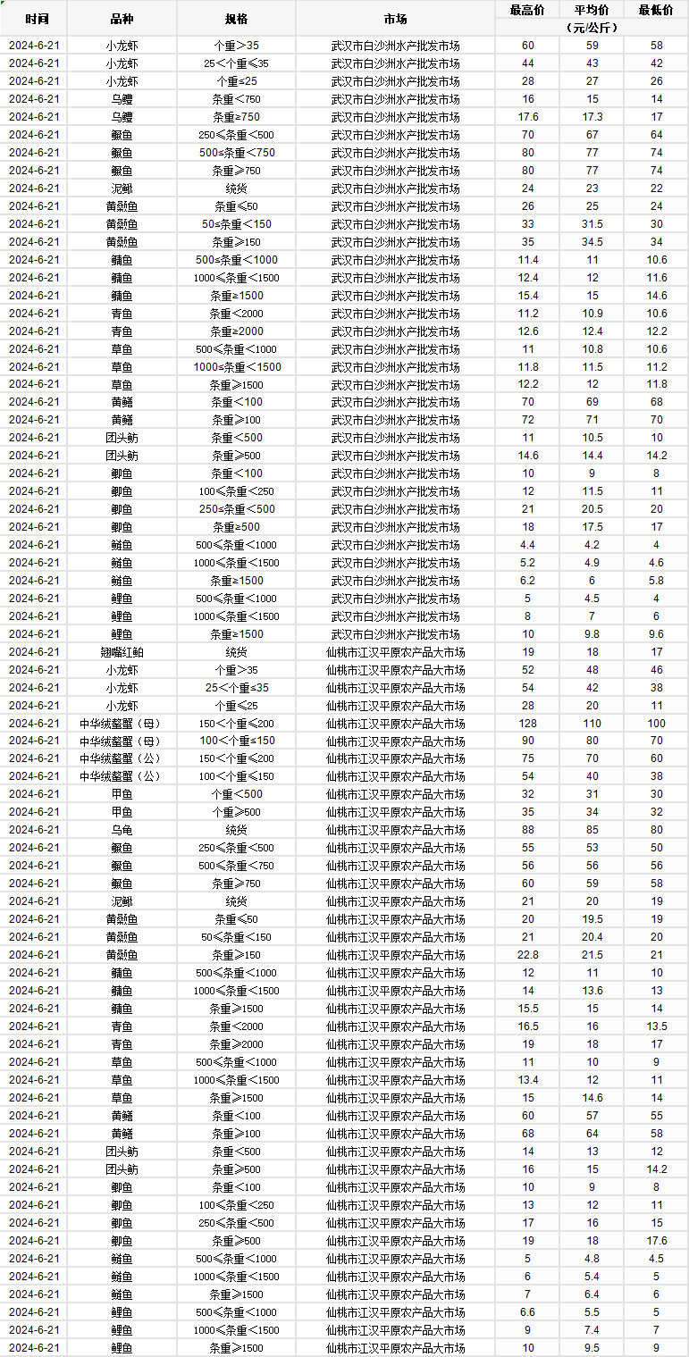 2024年6月21日 行情|湖北省主要水产品价格明细