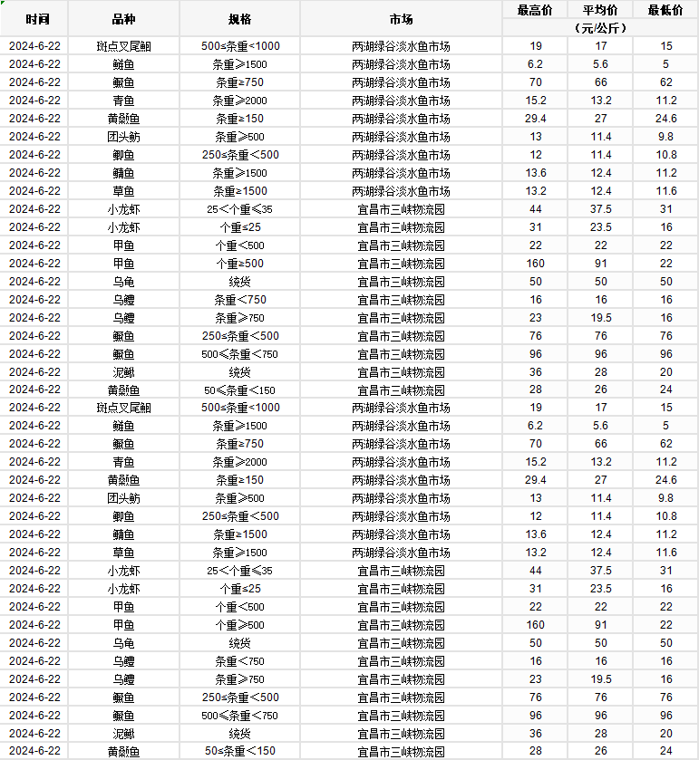 2024年6月22日 行情|湖北省主要水产品价格明细