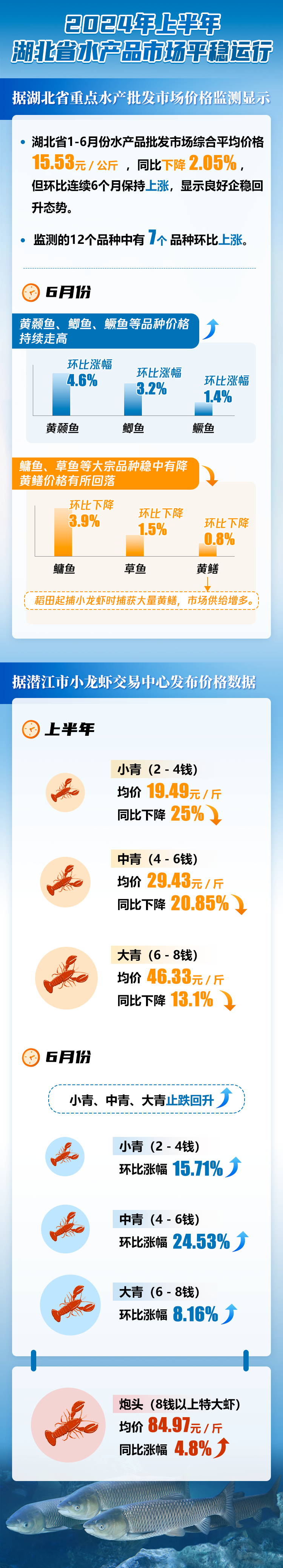 连续6个月环比上涨!2024上半年我省水产品市场平稳运行 2024-07-19 10:15 0 来源 | 湖北省农业事业发展中心 编辑 | 李金霞 编审 | 刘友智 监制 | 田国英 声明 | 本文转自以上平台,版权归原作者所有,如有侵权请联系删除
