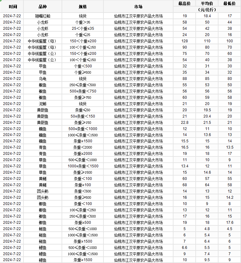 2024年7月22日 行情|湖北省主要水产品价格明细