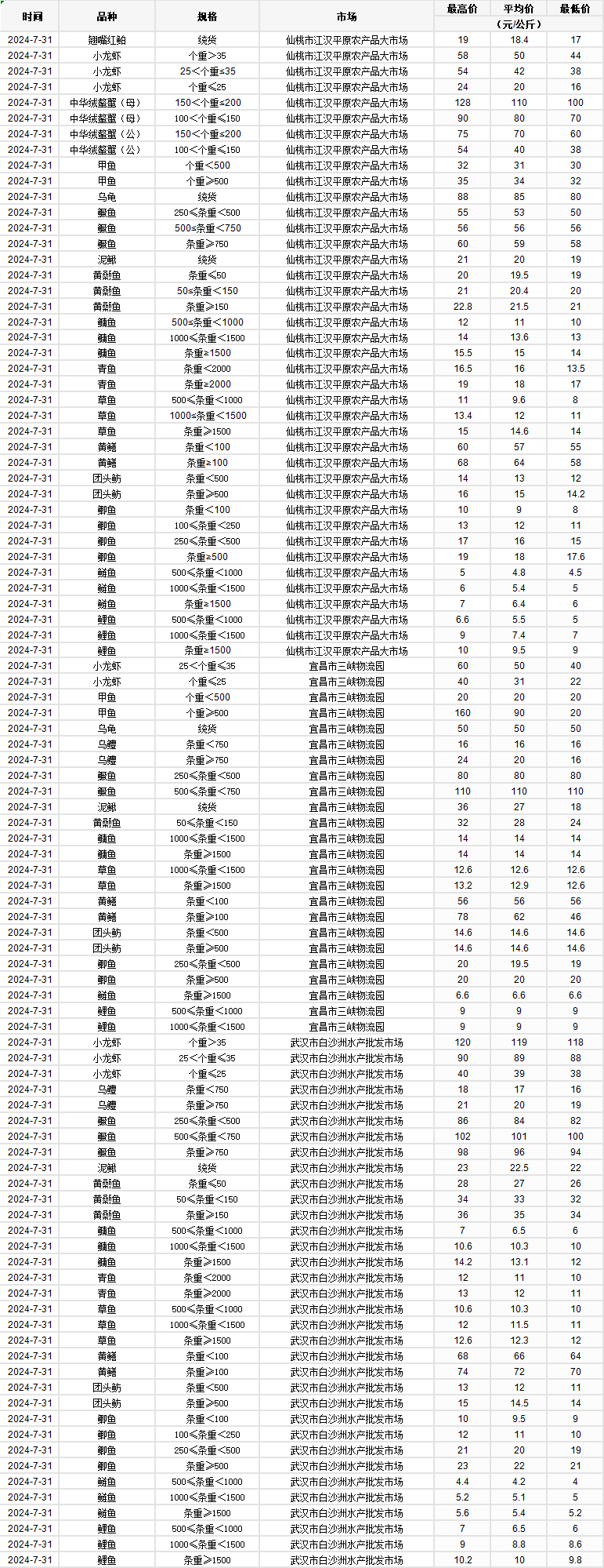 2024年7月31日 行情|湖北省主要水产品价格明细