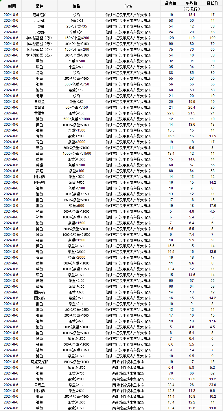2024年8月6日 行情|湖北省主要水产品价格明细