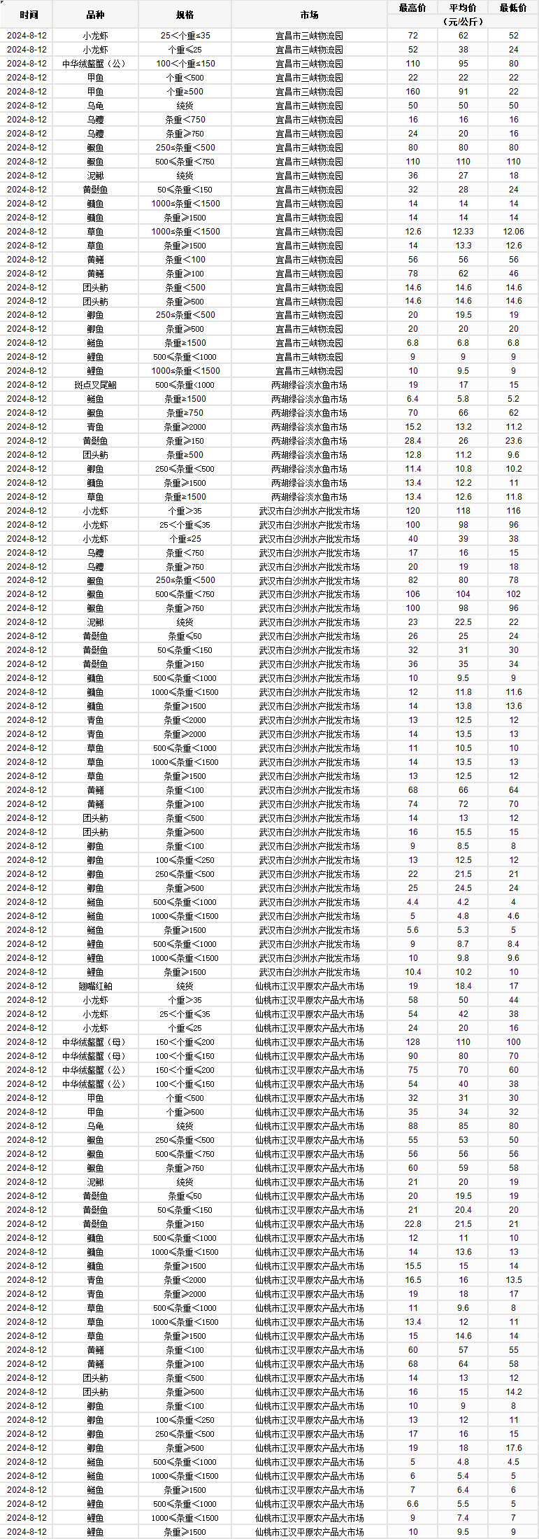 2024年8月12日 行情|湖北省主要水产品价格明细