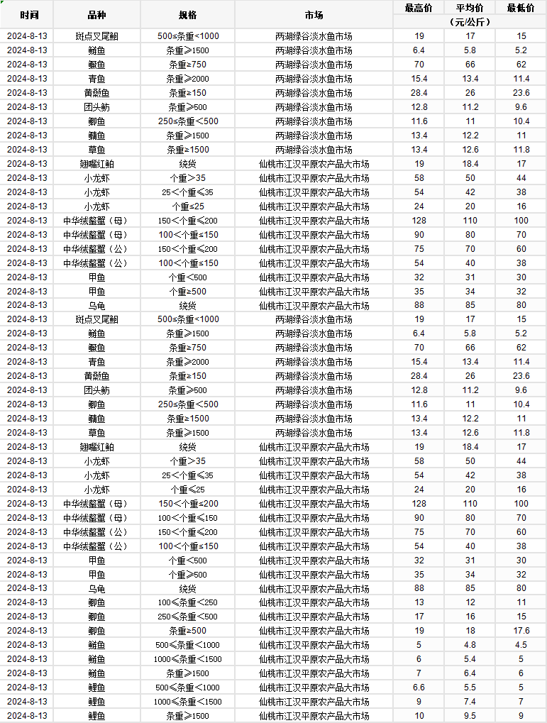 2024年8月13日 行情|湖北省主要水产品价格明细