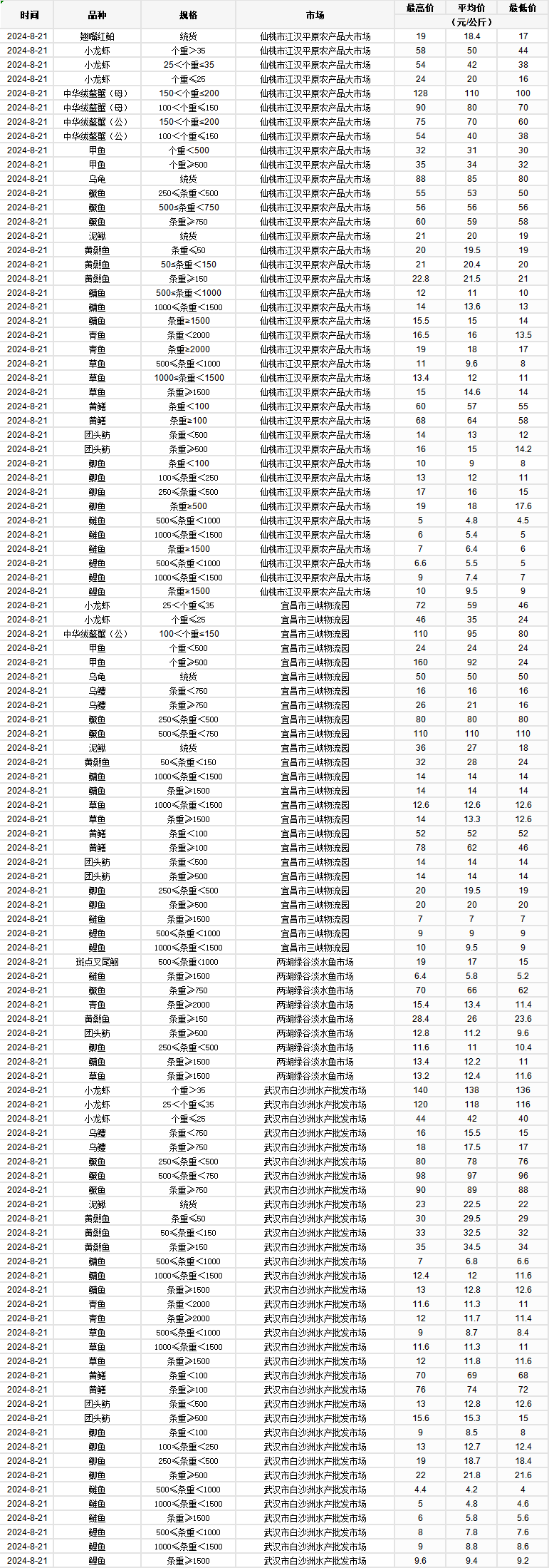 2024年8月21日 行情|湖北省主要水产品价格明细