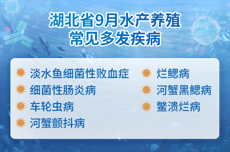 此时水温适宜水生动物生长,鱼病发生率和死亡率也有所减缓,但仍需重点关注一些水生动物疾病。根据近年同期全省水产养殖病情测报数据分析,对9月易发疾病进行预测并提出防控建议,供大家参考。