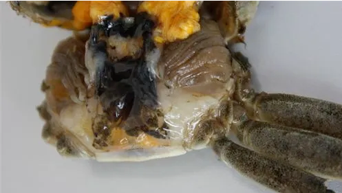 河蟹患黑鳃病后鳃丝呈暗灰色