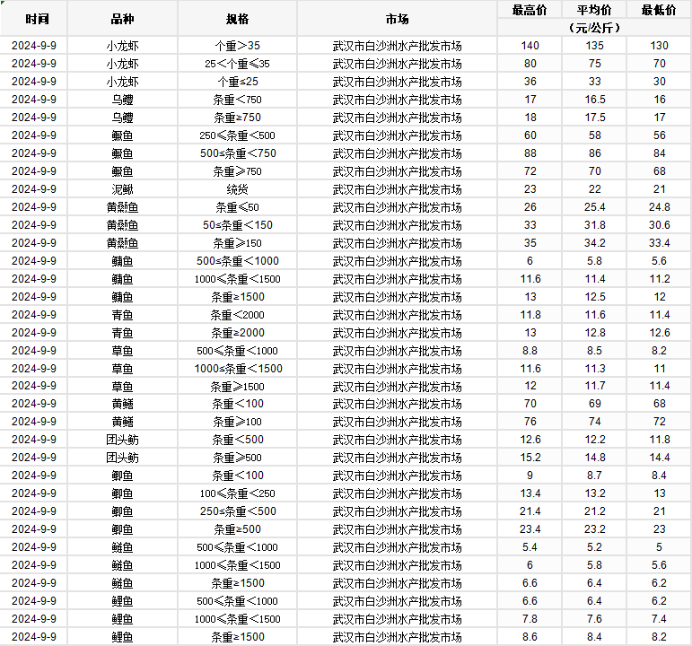 2024年9月9日 行情|湖北省主要水产品价格明细