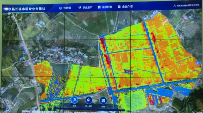 而同一时间,合作社理事长潘新星正在办公室里通过智慧农业大田管理系统察看水稻长势,为后续作业提供技术参考。