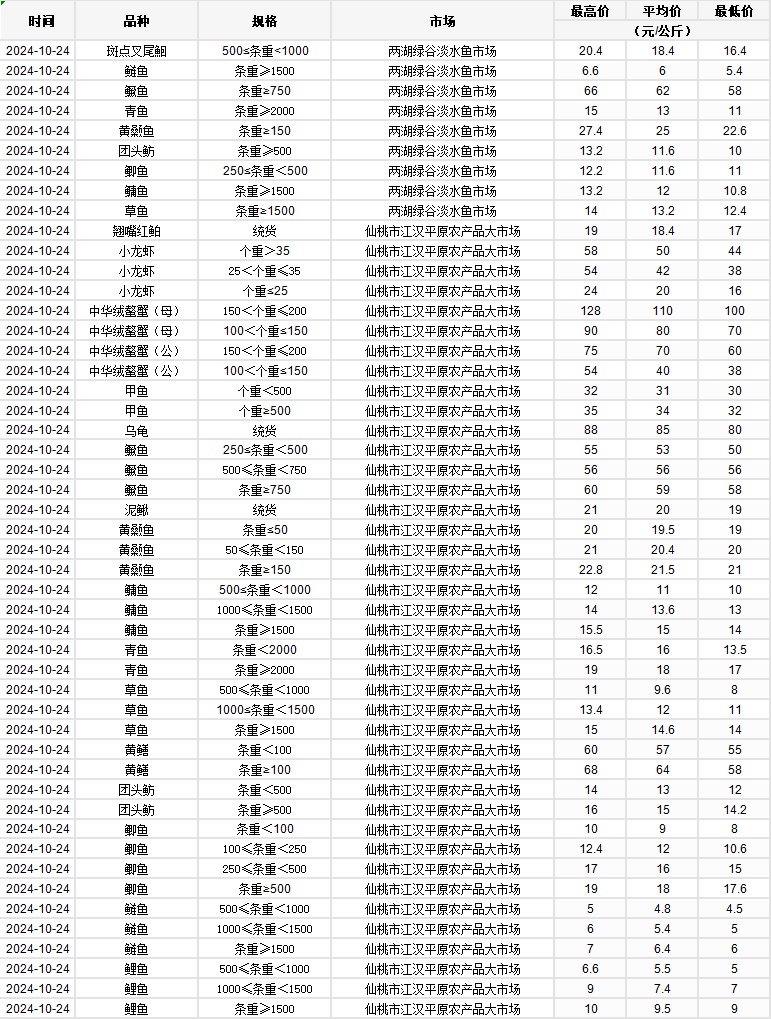 2024年10月24日 行情|湖北省主要水产品价格明细
