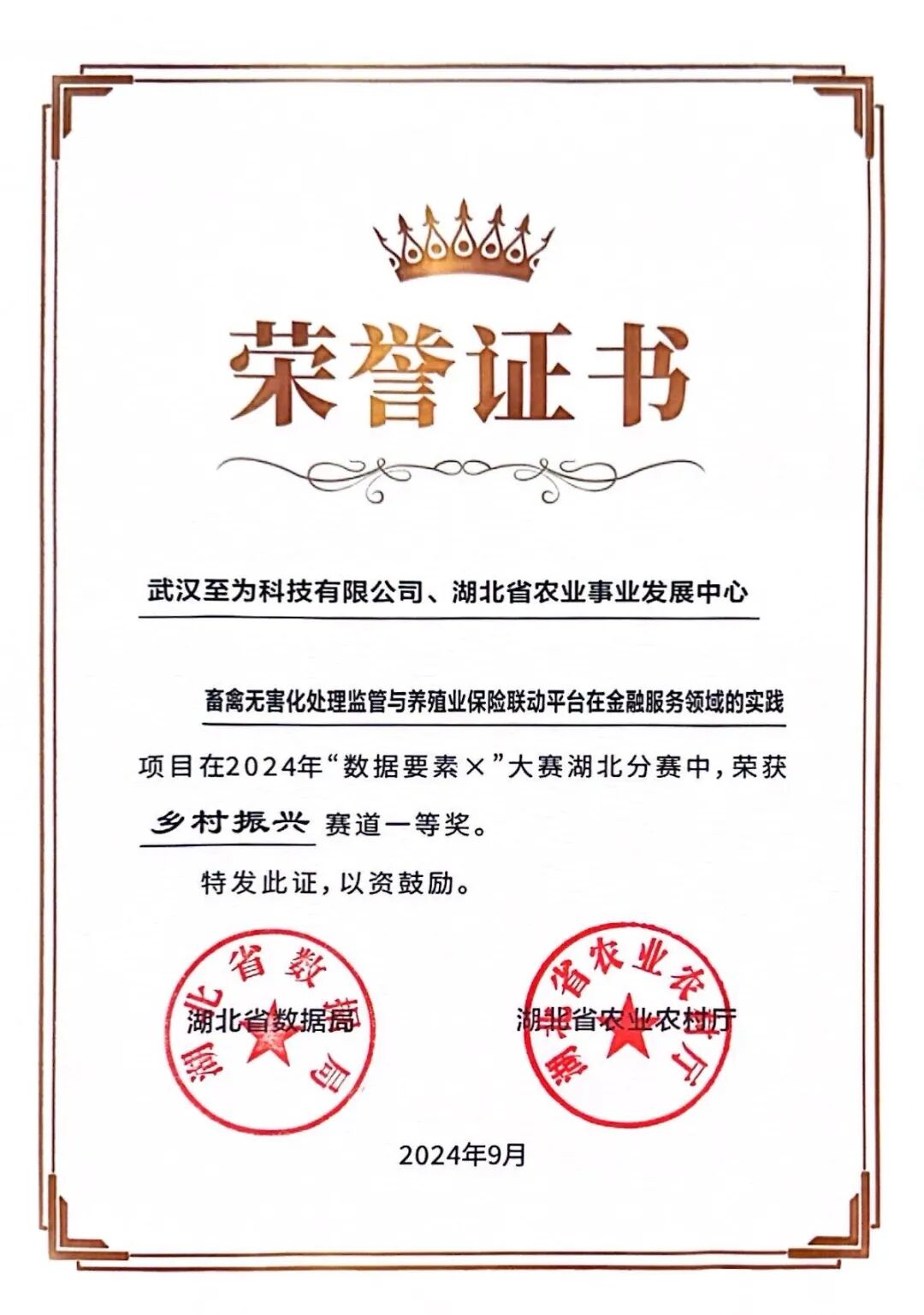 近日,在首届湖北省数据要素创新大会暨2024年“数据要素×”大赛湖北分赛上,由省农业发展中心联合武汉至为科技有限公司申报的“畜禽无害化处理监管与养殖业保险联动平台在金融服务领域的实践”项目,荣获乡村振兴赛道一等奖。