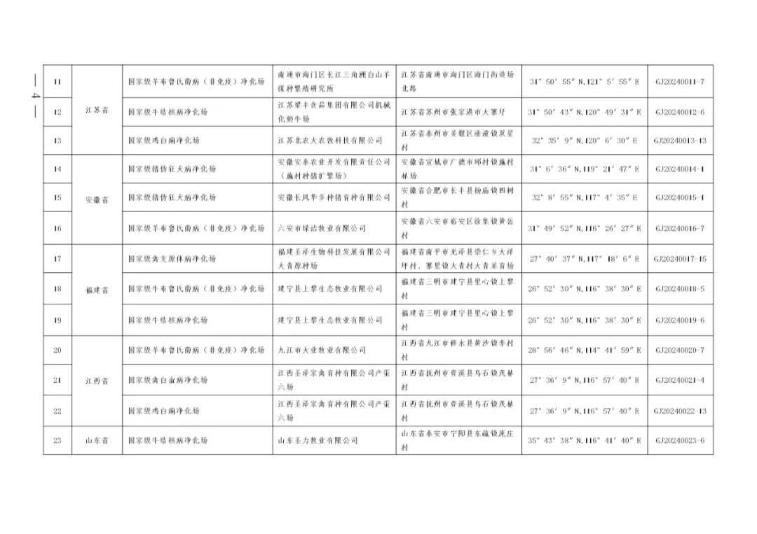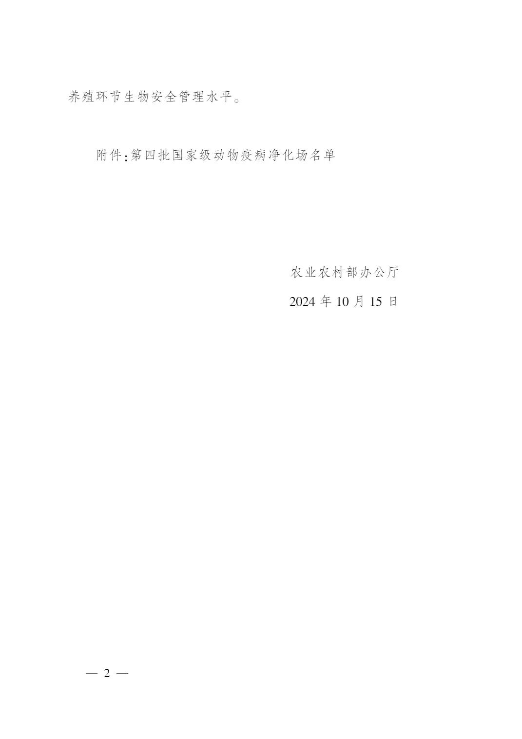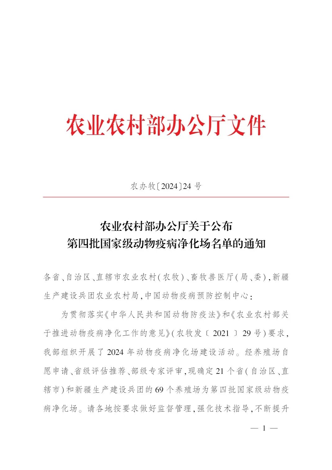 为贯彻落实《中华人民共和国动物防疫法》和《农业农村部关于推进动物疫病净化工作的意见》(农牧发﹝2021﹞29号)要求,我部组织开展了2024年动物疫病净化场建设活动。经养殖场自愿申请、省级评估推荐、部级专家评审,现确定21个省(自治区、直辖市)和新疆生产建设兵团的69个养殖场为第四批国家级动物疫病净化场。请各地按要求做好监督管理,强化技术指导,不断提升养殖环节生物安全管理水平。