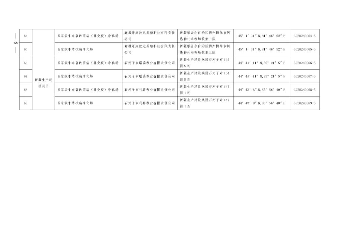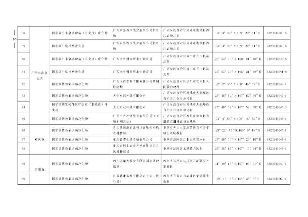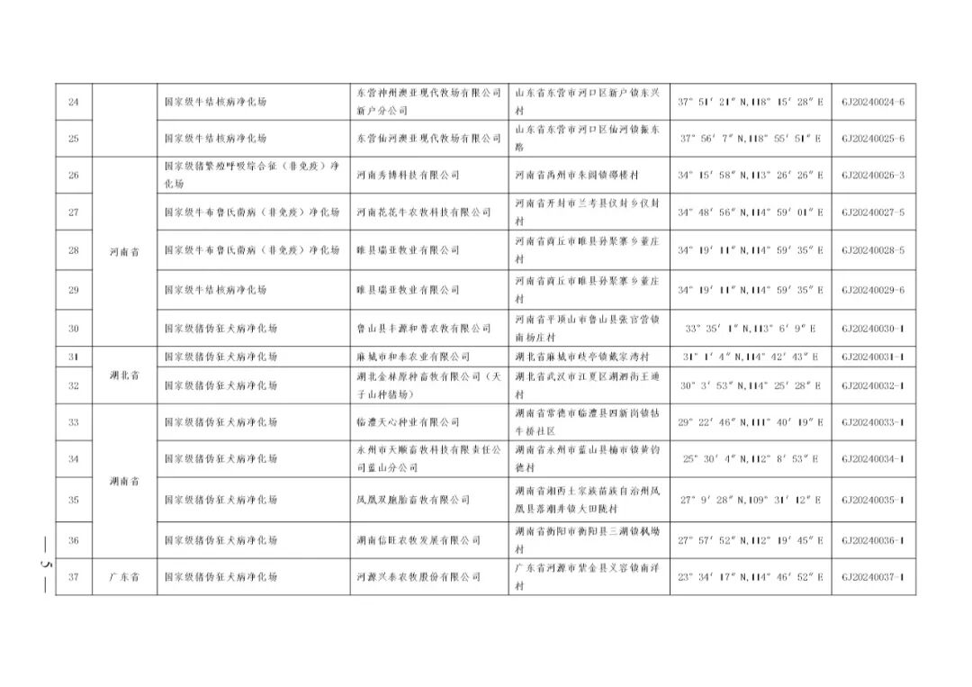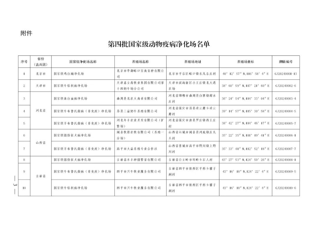 为贯彻落实《中华人民共和国动物防疫法》和《农业农村部关于推进动物疫病净化工作的意见》(农牧发﹝2021﹞29号)要求,我部组织开展了2024年动物疫病净化场建设活动。经养殖场自愿申请、省级评估推荐、部级专家评审,现确定21个省(自治区、直辖市)和新疆生产建设兵团的69个养殖场为第四批国家级动物疫病净化场。请各地按要求做好监督管理,强化技术指导,不断提升养殖环节生物安全管理水平。