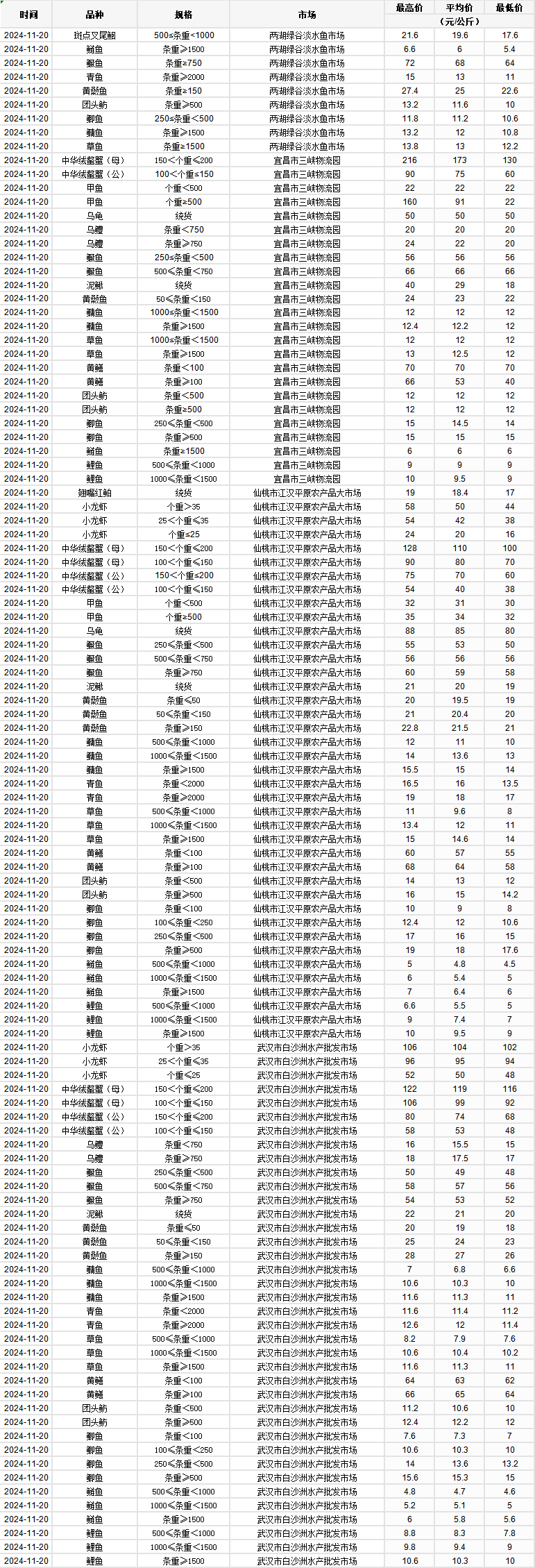 2024年11月20日 行情|湖北省主要水产品价格明细