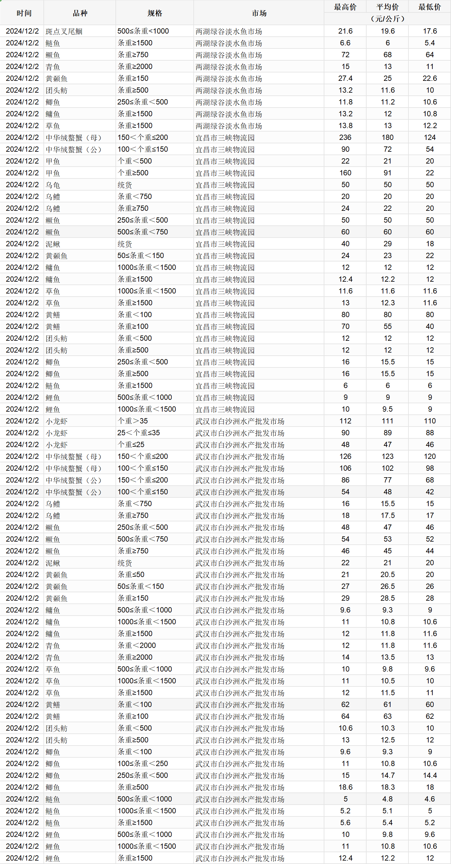 2024年12月2日 行情|湖北省主要水产品价格明细