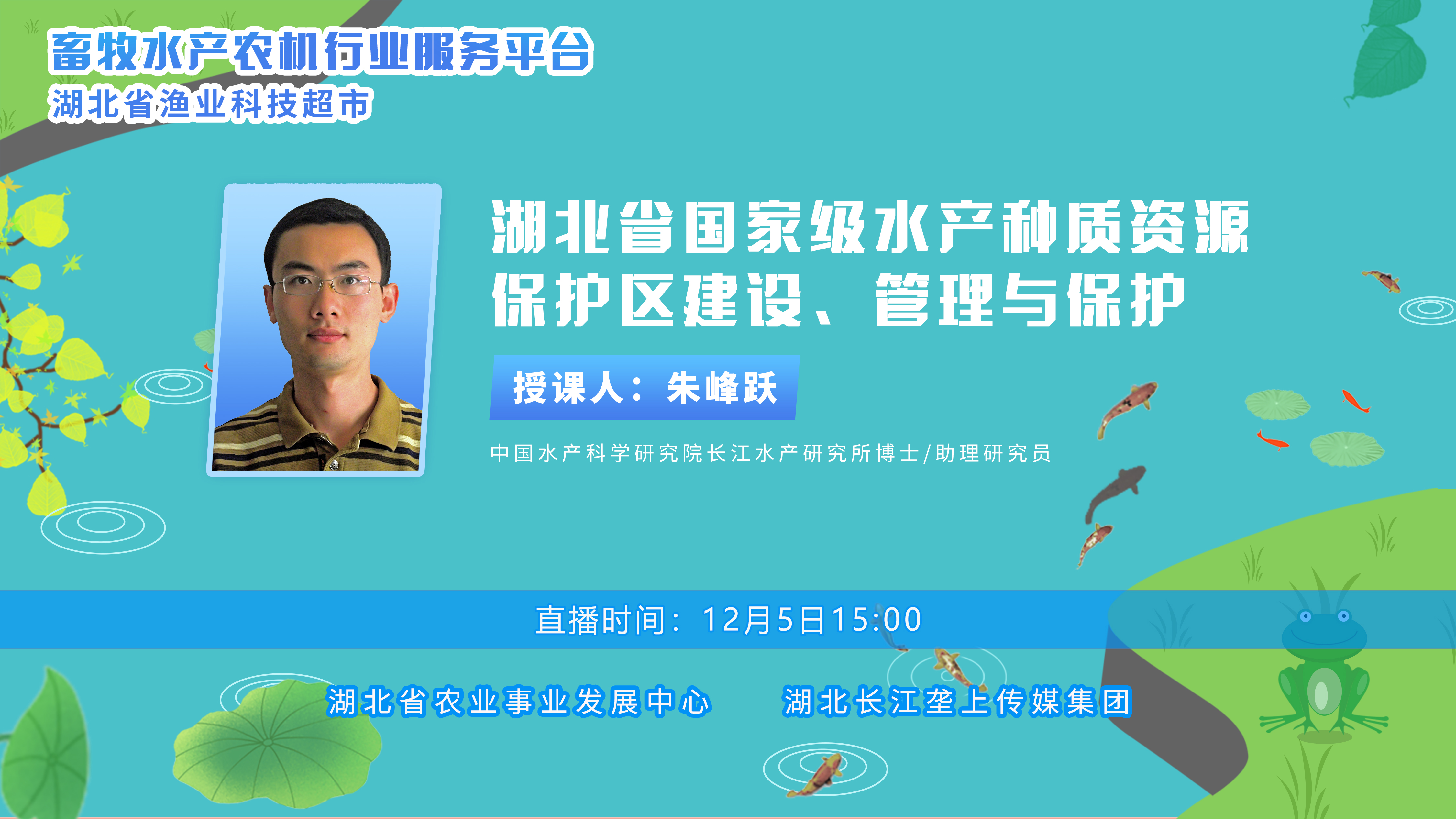 直播预告|湖北省国家级水产种质资源保护区建设、管理与保护 2024-12-05 11:08 0 畜牧水产农机行业服务平台 ——湖北省渔业科技超市 现场云直播观看入口 云上垄上直播观看入口 1直播时间12月5日15:00 2直播主题湖北省国家级水产种质资源保护区 建设、管理与保护 3直播嘉宾中国水产科学研究院长江水产研究所 博士、助理研究员朱峰跃 编辑 | 李金霞 编审 | 刘友智 何聆溪 监制 | 田国英 刘迎春