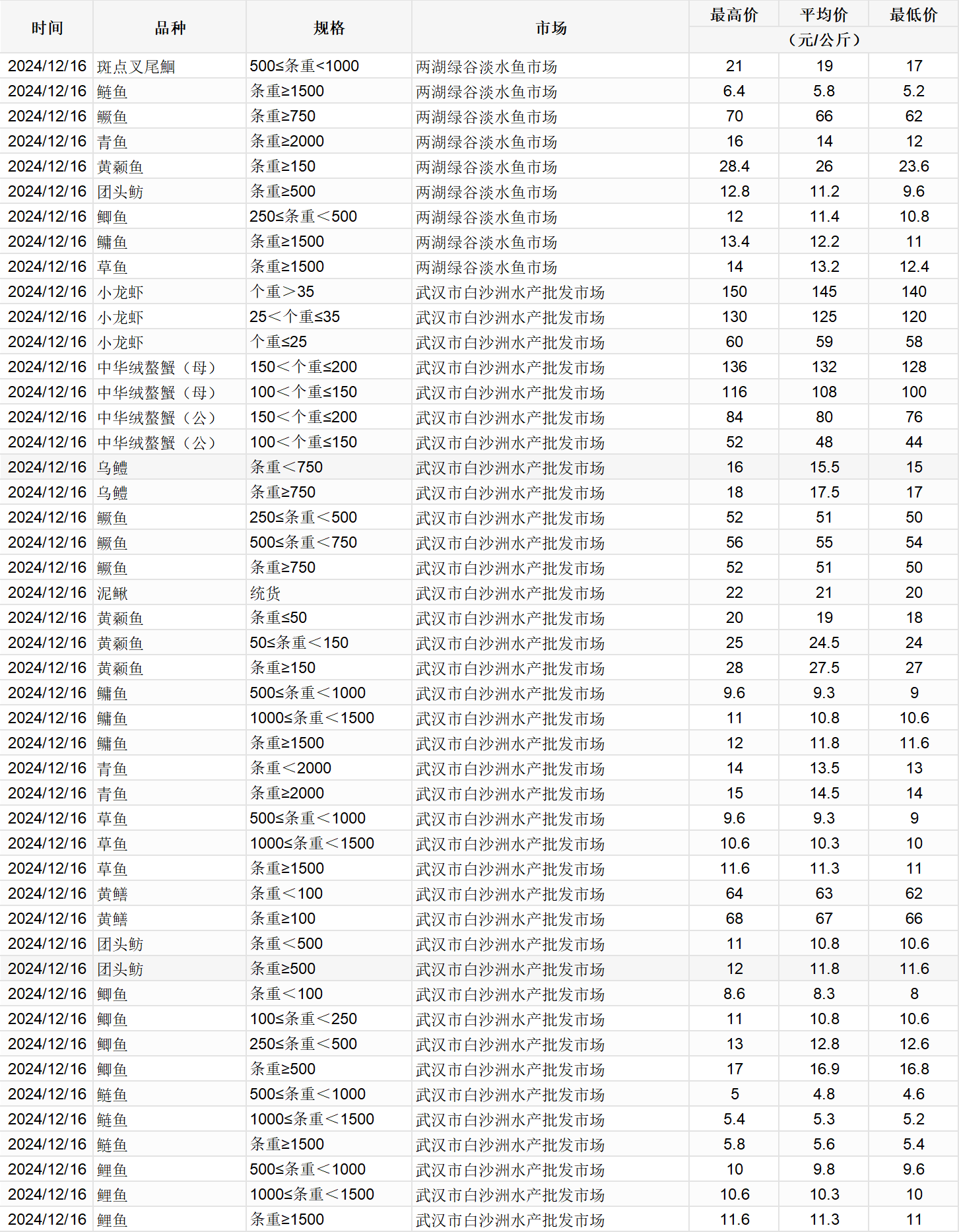 2024年12月16日 行情|湖北省主要水产品价格明细