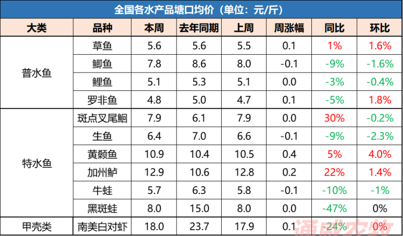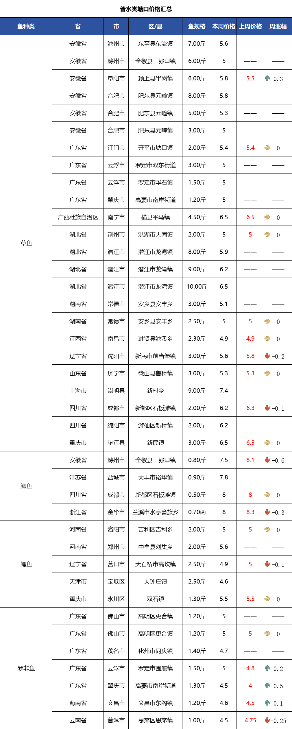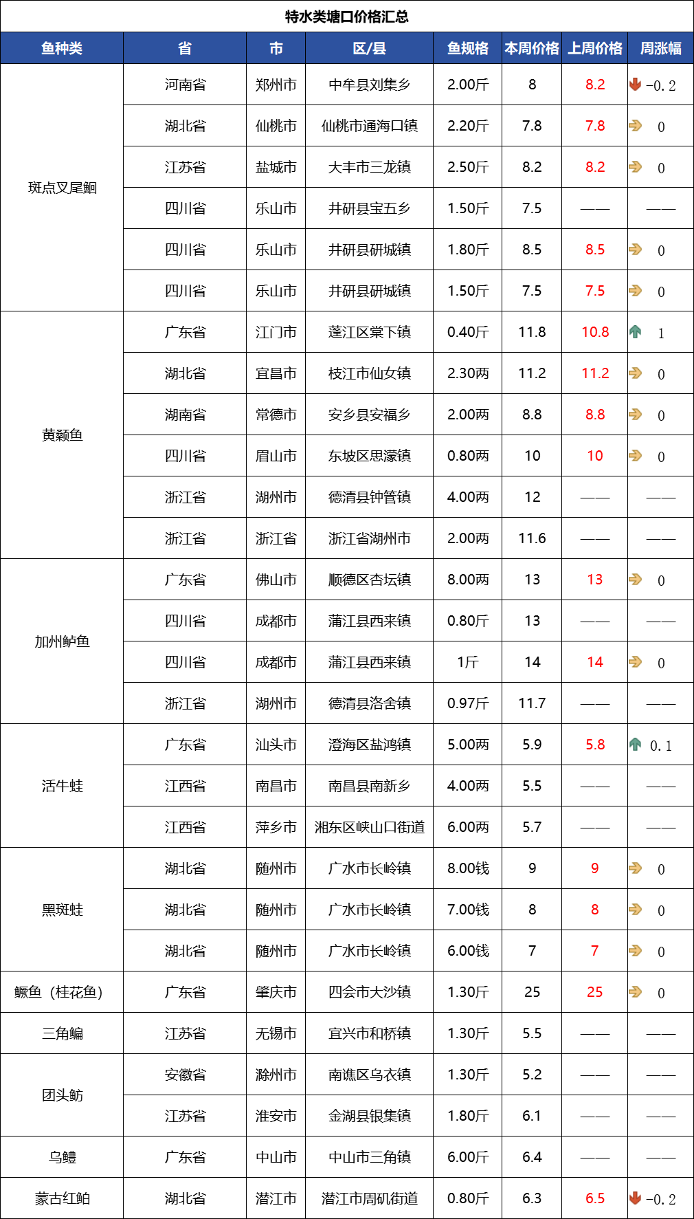上涨的品种是草鱼、罗非鱼、黄颡鱼、加州鲈;下跌的品种是鲫鱼、生鱼;鲤鱼、叉尾鮰、黑斑蛙、对虾价格与上周基本持平。