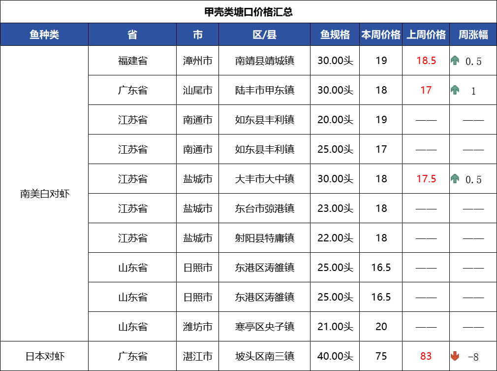 华东地区:江苏南通地区近期小棚虾大量出售,20-25头对虾价格较上周下跌1元/斤。盐城、东台地区对虾基本达上市规格,市场供应充足,价格与上周基本持平,22头虾价格约18元/斤,大丰地区30头虾价格约18元/斤。