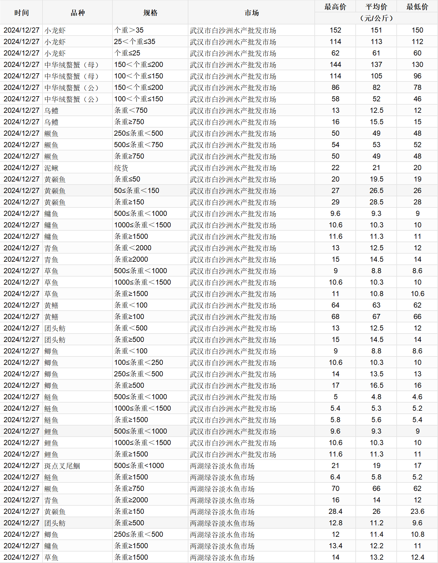 2024年12月27日 行情|湖北省主要水产品价格明细
