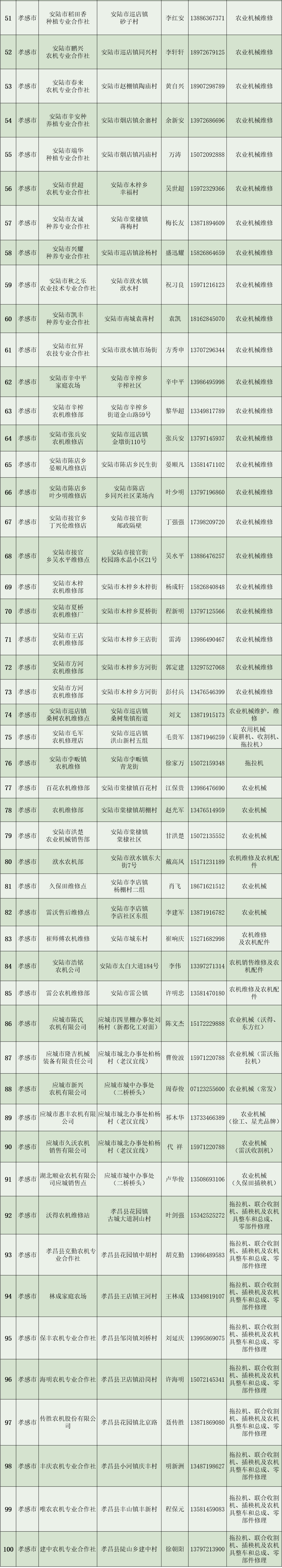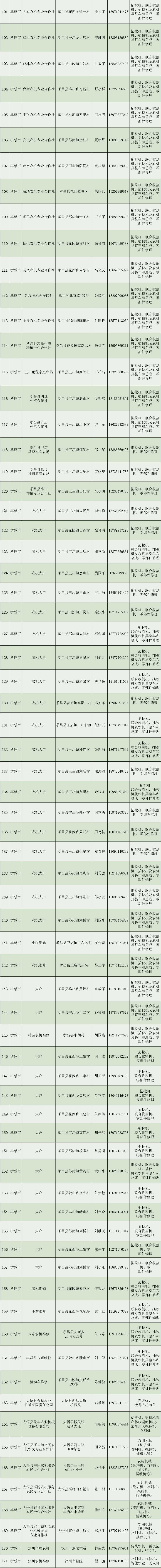 为更好地服务全省农业生产,保障农业机械化高效、安全、可持续发展,确保农机具在关键农时的正常运转,现将孝感市农机维修网点及重点品牌农机维修店信息予以发布。(武汉、襄阳、宜昌、黄石、十堰、黄冈、荆州、鄂州、荆门、孝感已发布,其他地区将分批发布)