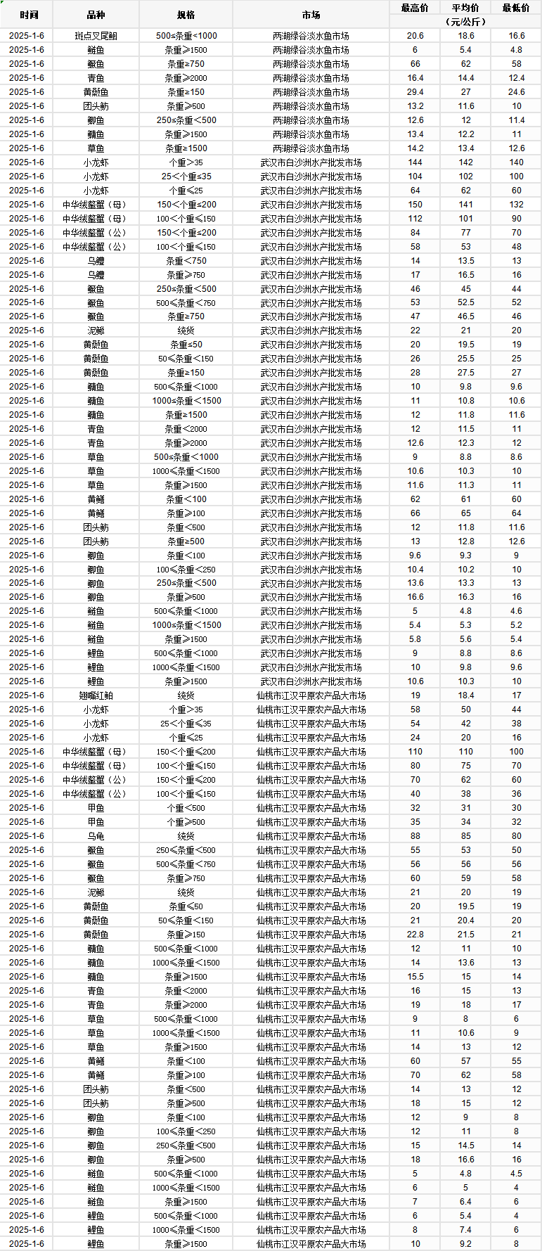 2025年1月6日 行情|湖北省主要水产品价格明细