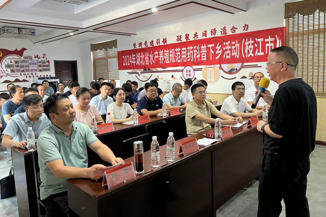于华爱农业示范基地举办用药减量及水产品质量安全培训会,相关水产技术人员及周边渔民共50余人参会,发布7期全市水产养殖病害预测预报,发放张贴用药明白纸1000份以上。
