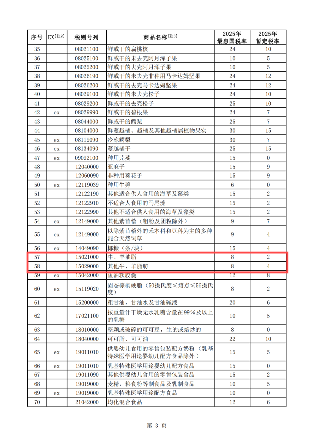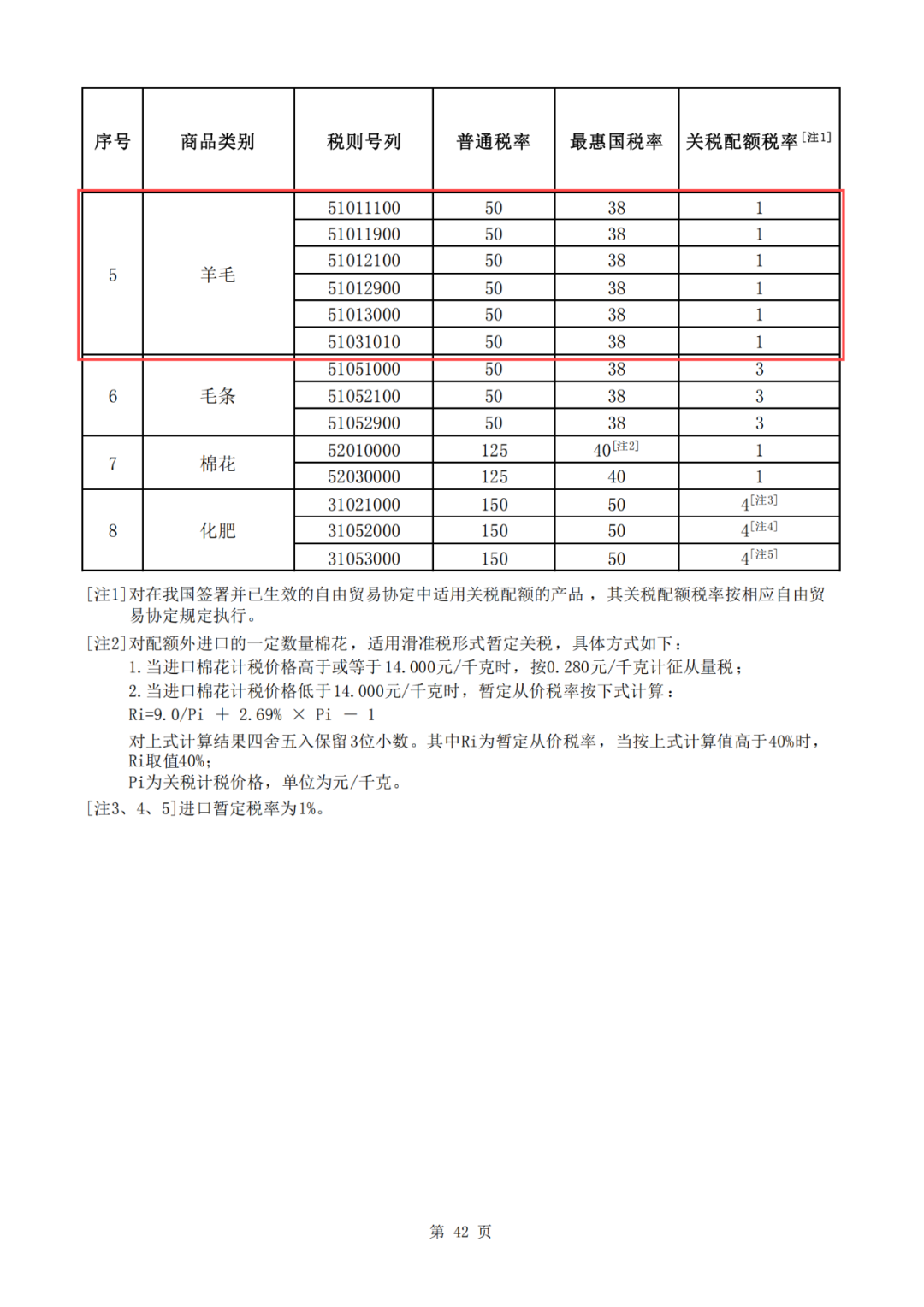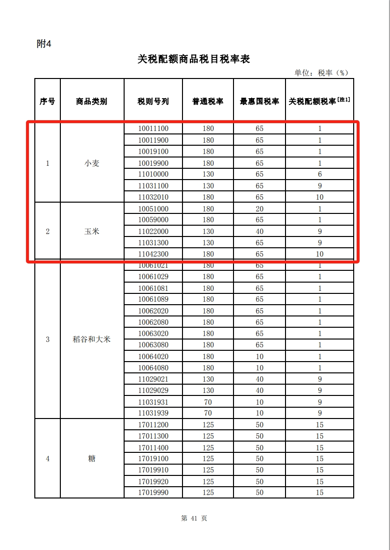 备注:对在我国签署并已生效的自由贸易协定中适用关税配额的产品 ,其关税配额税率按相应自由贸易协定规定执行。