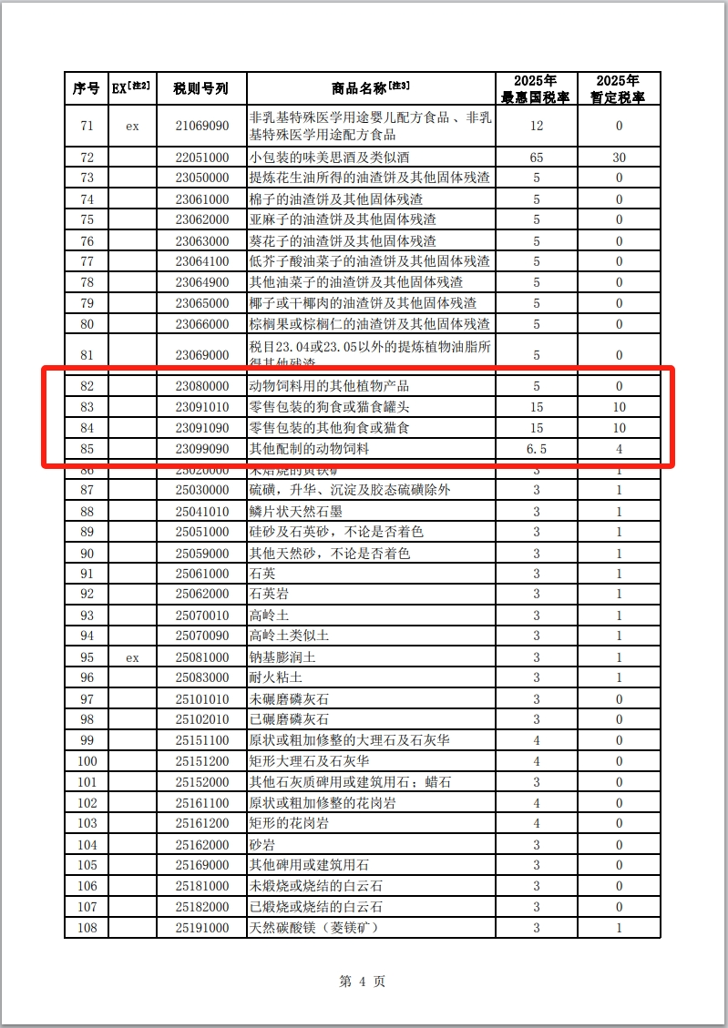 为深入贯彻落实党的二十大和二十届二中、三中全会精神,充分发挥关税宏观调控作用,支持发展新质生产力,加快建设贸易强国,扎实稳健推进中国式现代化建设,根据《中华人民共和国关税法》及相关规定,2025年1月1日起,对部分商品的进口关税税率和税目进行调整,具体内容见附件。
