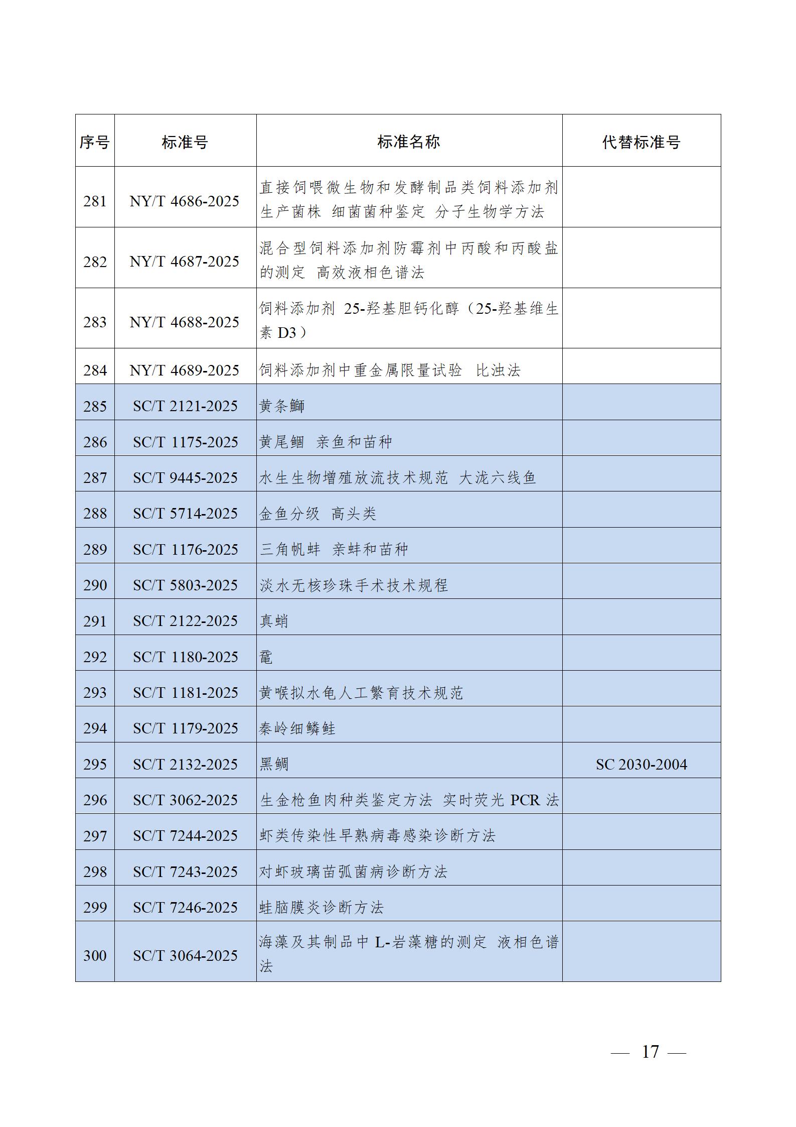 该批标准文本由中国农业出版社出版,可于发布之日起2个月后在农业农村部农产品质量安全中心网(http://www.aqsc.agri.cn)查阅。330项农业行业标准目录全文如下,涉渔部分已用蓝色标出。