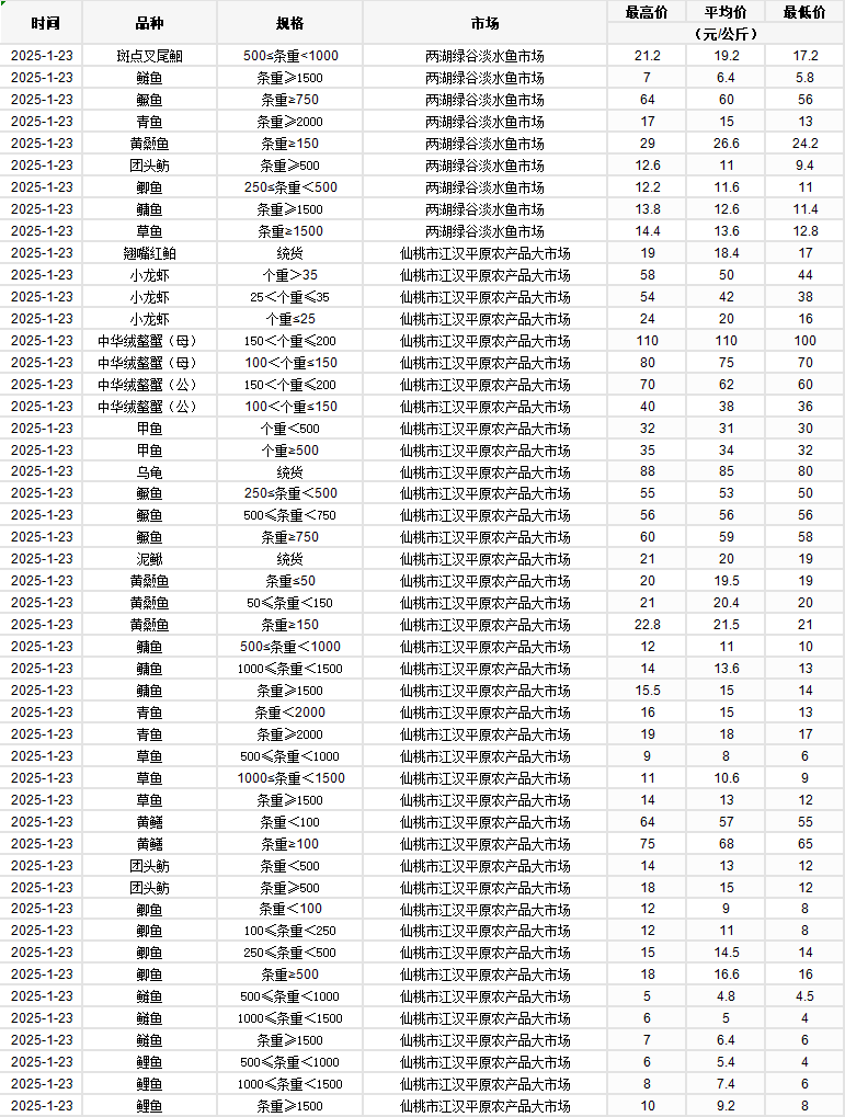 2025年1月23日 行情|湖北省主要水产品价格明细