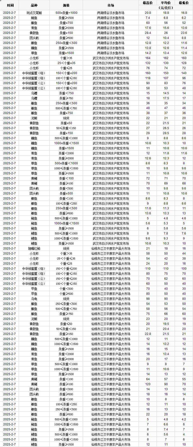 2025年2月7日 行情|湖北省主要水产品价格明细