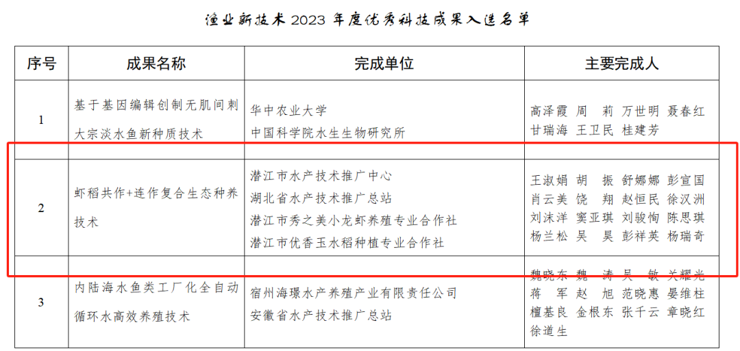 创新发展稻渔综合种养新模式,“无沟化稻田虾稻轮作技术”“稻虾共作+连作复合生态种养技术”获“全国渔业新技术2023年度优秀科技成果”奖。