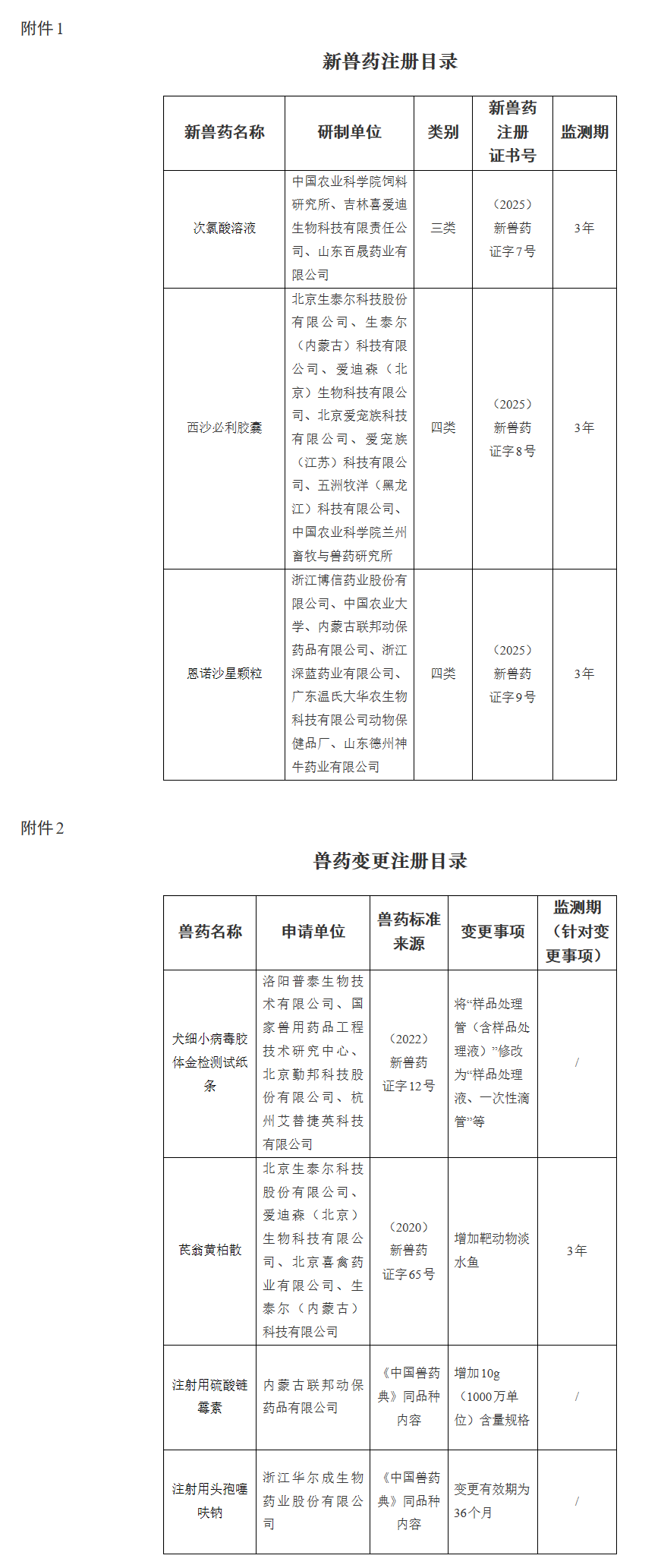 批准洛阳普泰生物技术有限公司等4家单位申报的犬细小病毒胶体金检测试纸条变更注册,发布修订后的质量标准、工艺规程、说明书和标签,自发布之日起执行,此前发布的该产品质量标准、工艺规程、说明书和标签同时废止;批准北京生泰尔科技股份有限公司等4家单位申报的芪翁黄柏散变更注册,发布修订后的说明书和标签,自发布之日起执行;批准内蒙古联邦动保药品有限公司等2家单位申报的注射用硫酸链霉素等2种兽药产品变更注册,申请人按照农业农村部批准的变更事项,自行修改原批准的说明书和标签对应内容,并印制、使用。