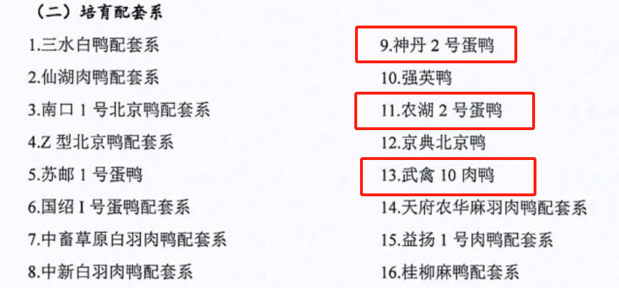 4个鸭品种:恩施麻鸭、荆江鸭、沔阳麻鸭、中国番鸭(阳新番鸭)。