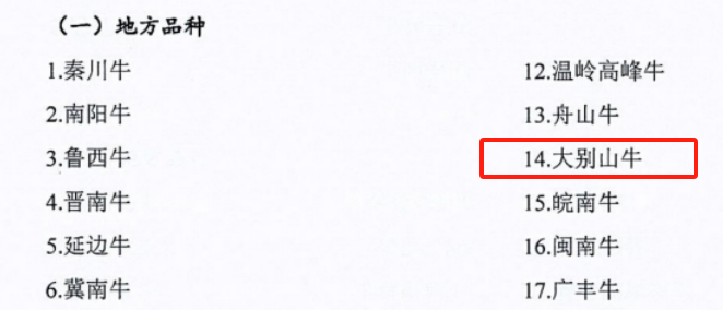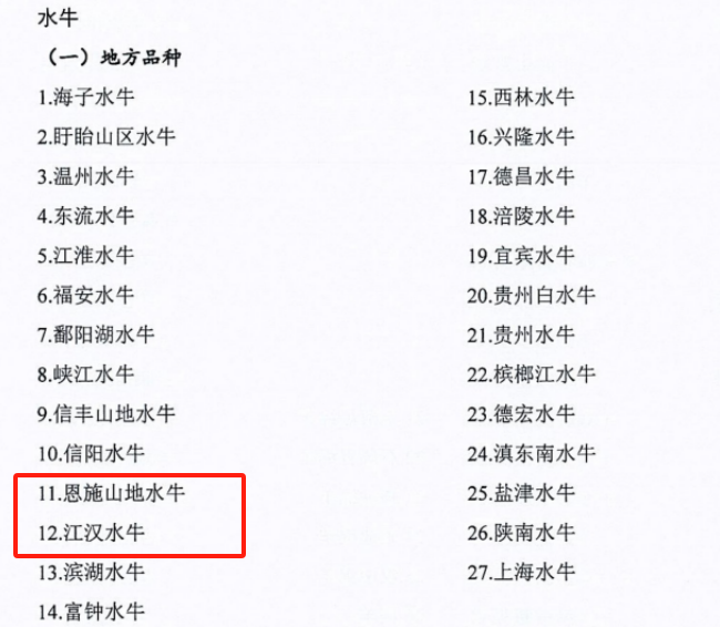 7个牛品种:大别山牛(黄陂黄牛)、枣北牛、巫陵牛(恩施黄牛)、巴山牛(郧巴黄牛)、夷陵牛、恩施山地水牛、江汉水牛。