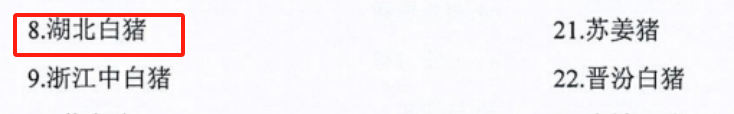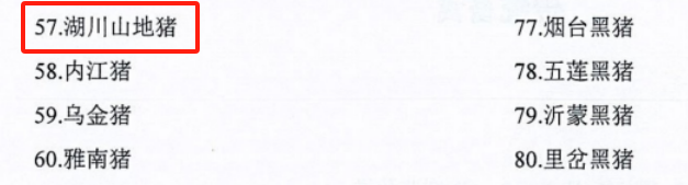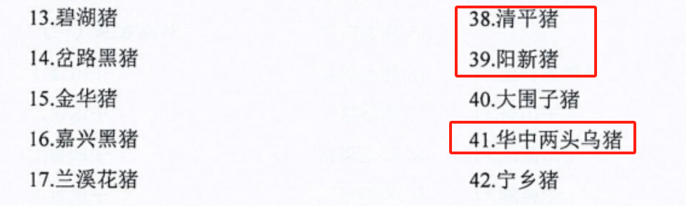 5个猪品种:清平猪、阳新猪、华中两头乌猪(通城猪、监利猪)、湖川山地猪(恩施黑猪)。