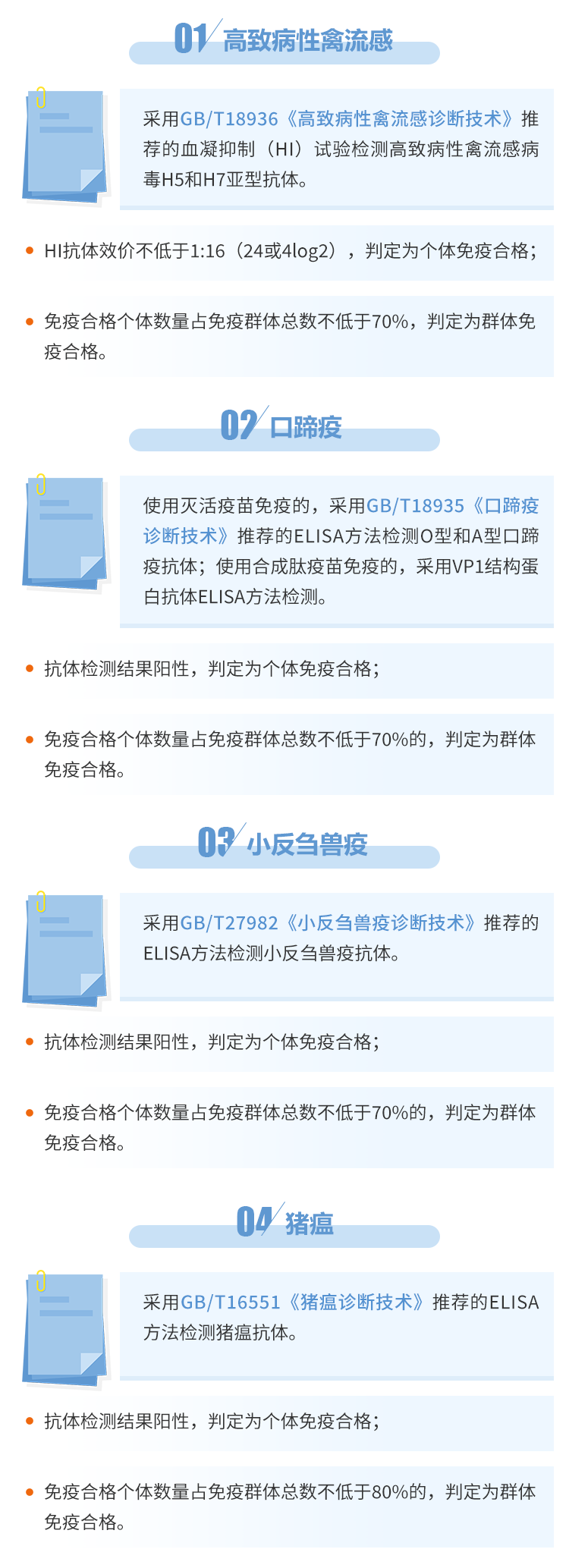 免疫口蹄疫疫苗的猪在免疫28天后进行采样,其他家畜免疫21天后进行采样;免疫禽流感、猪瘟、小反刍兽疫疫苗的畜禽均在免疫21天后进行采样。