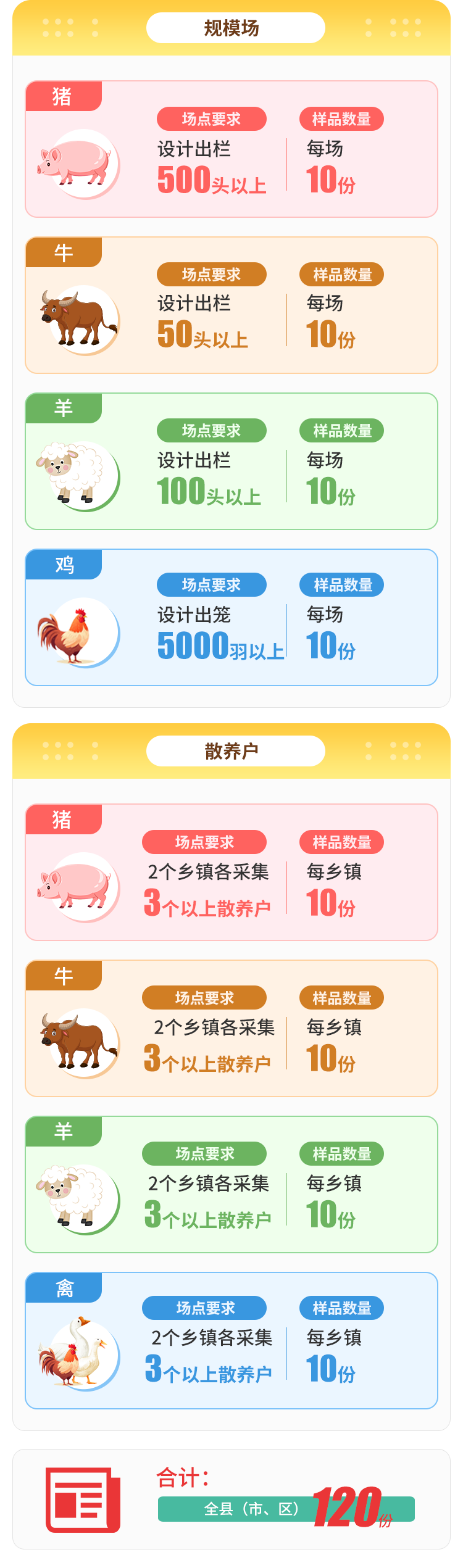评估按照随机抽样原则进行样品采集,采集猪、牛、羊、鸡规模场和散养户共120份全血样品。采样数量及场点要求见下表。