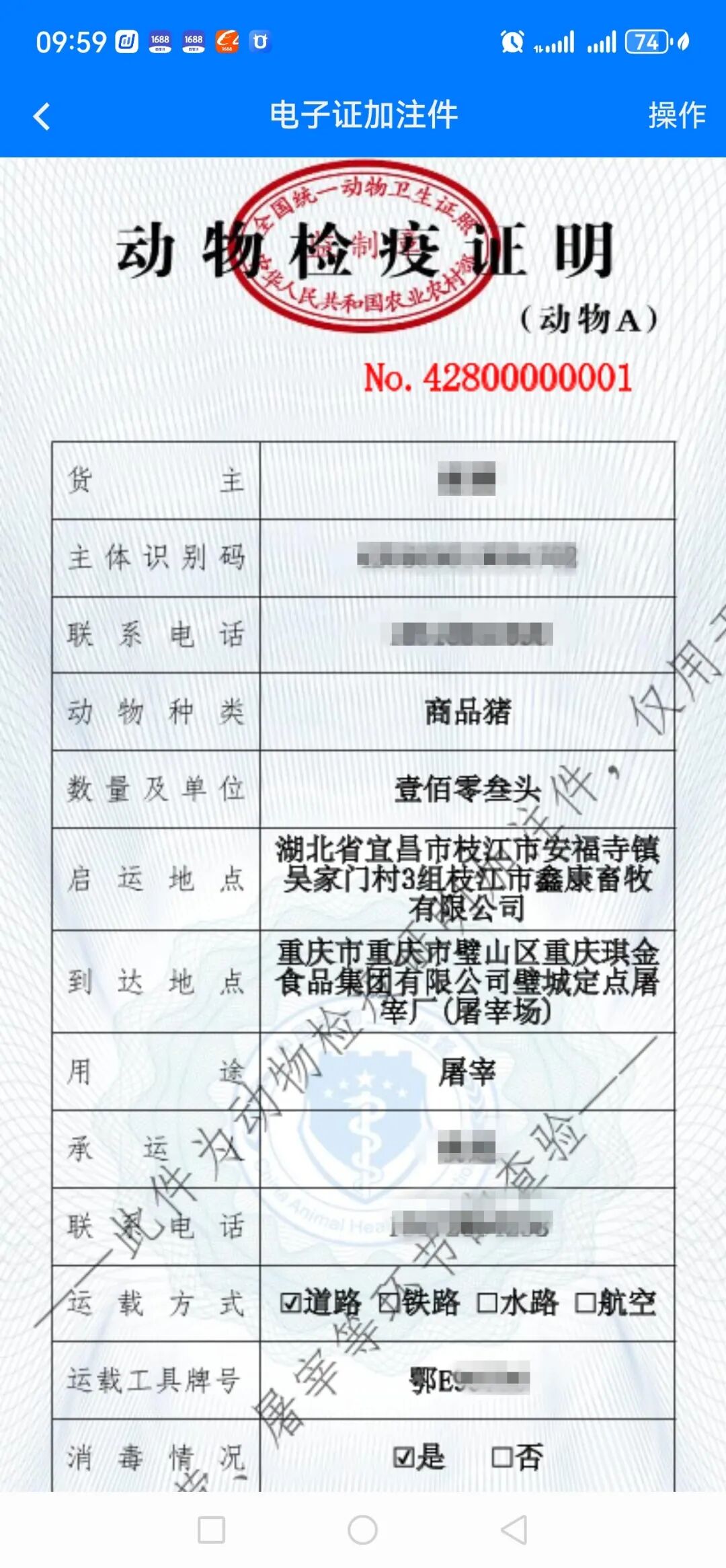 全省首份开往重庆的电子动物A证在枝江市出具成功(5月)
