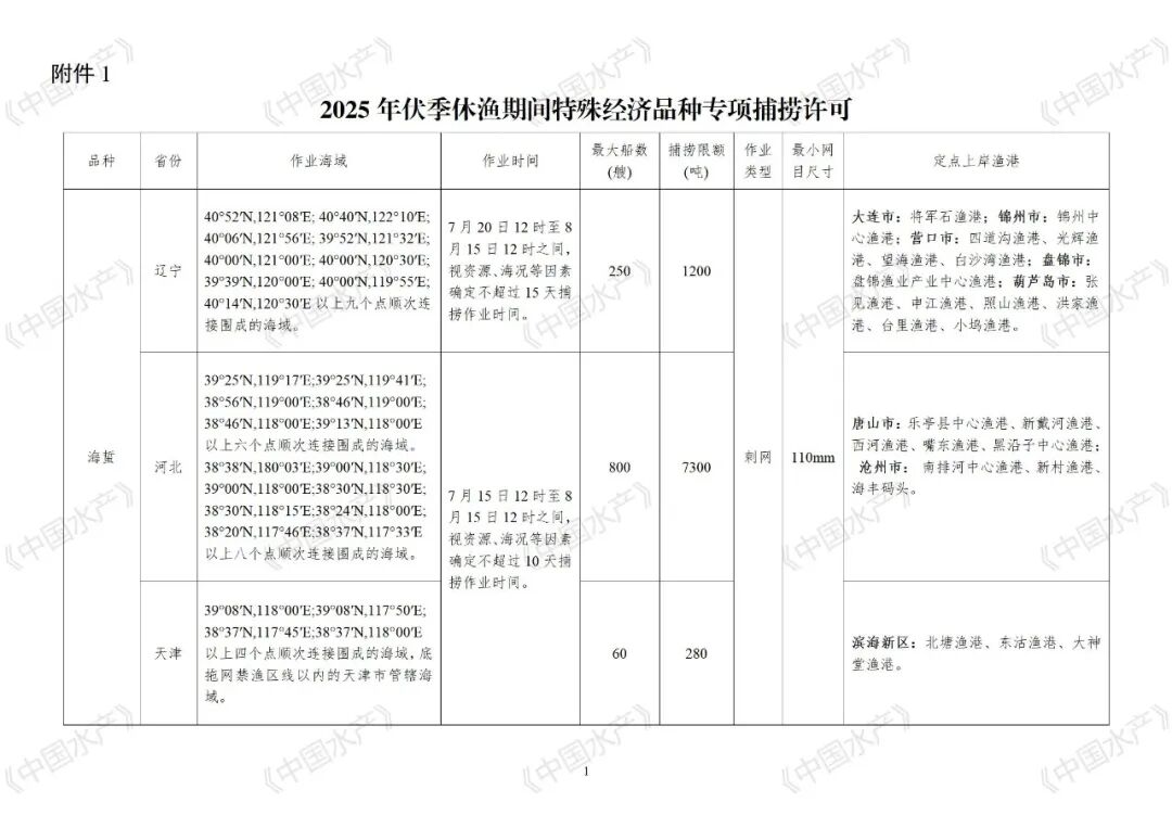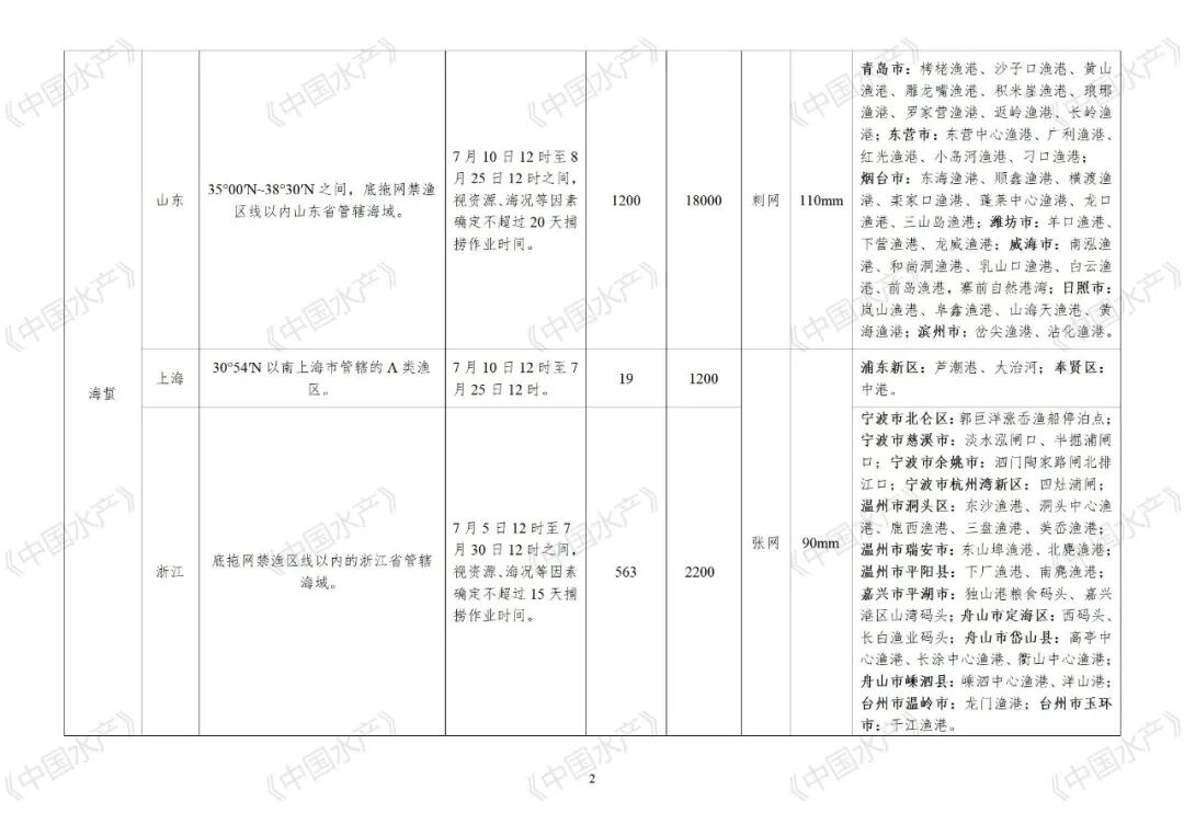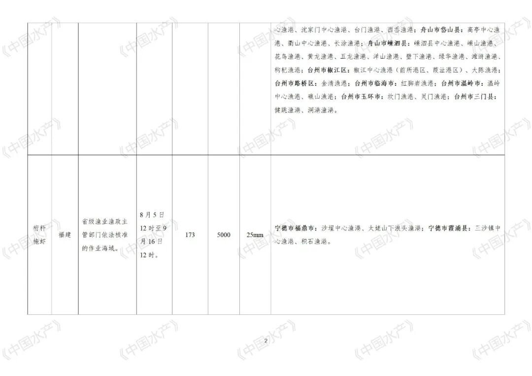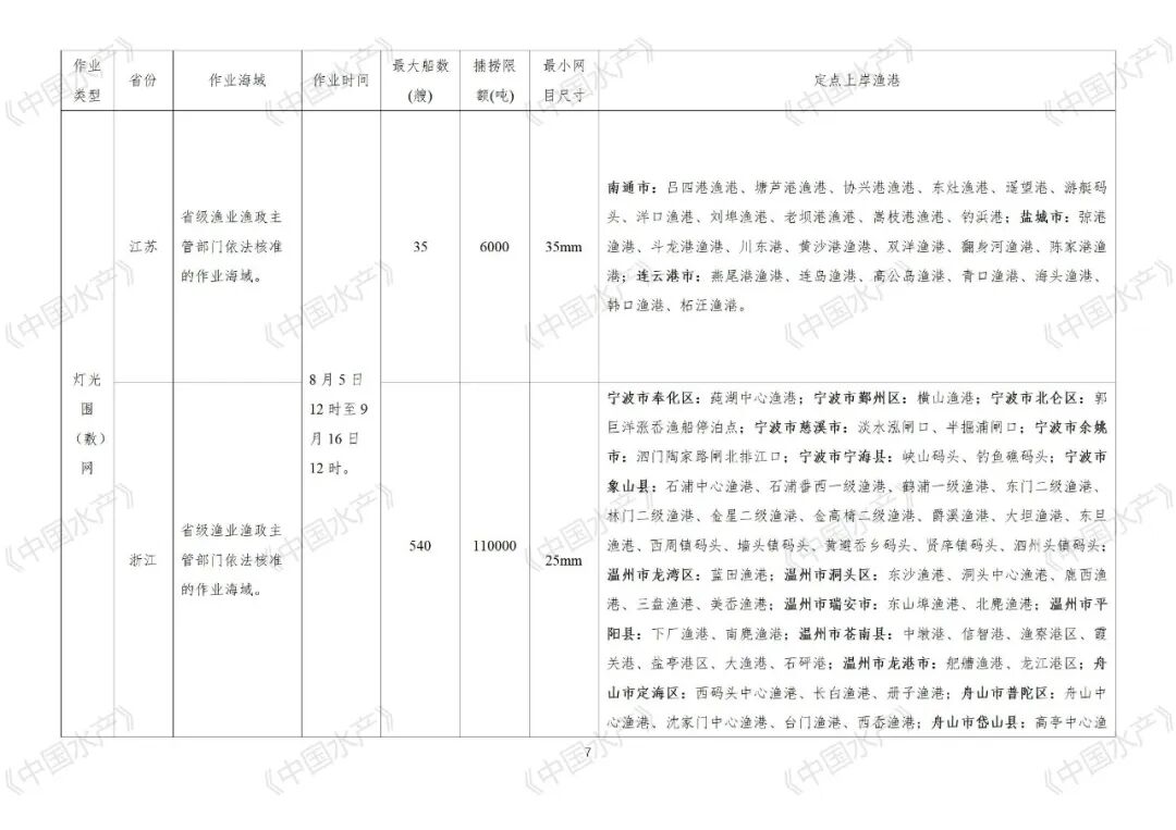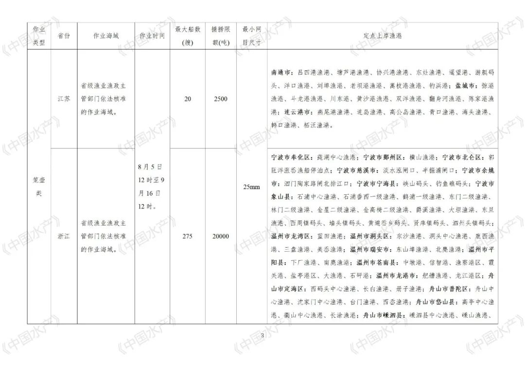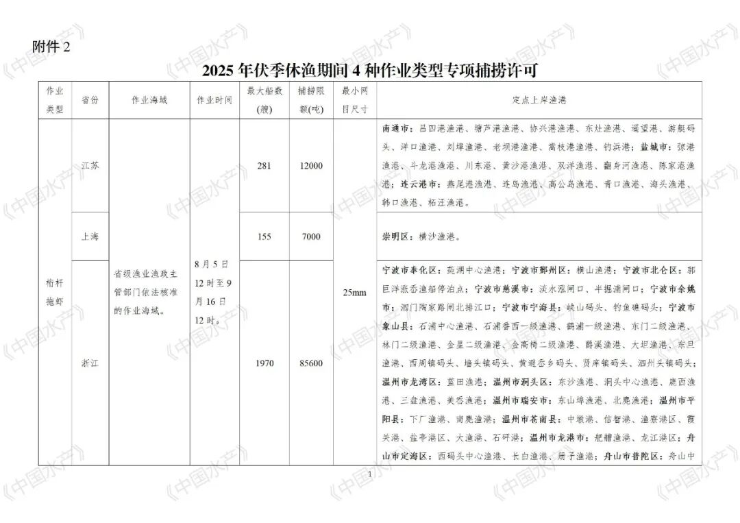 二、4种作业类型专项捕捞许可2025年伏季休渔期间许可北纬35度至北纬26度30分之间的黄海和东海海域桁杆拖虾、笼壶类、刺网和灯光围(敷)网4种作业类型渔船开展虾蟹类、中上层鱼类等资源专项捕捞。上述专项捕捞许可作业海域、作业时间、最大船数、捕捞限额、渔具最小网目尺寸和定点上岸渔港等详见附件2。