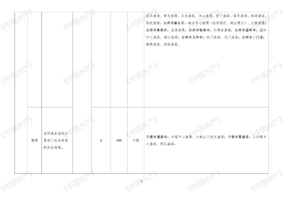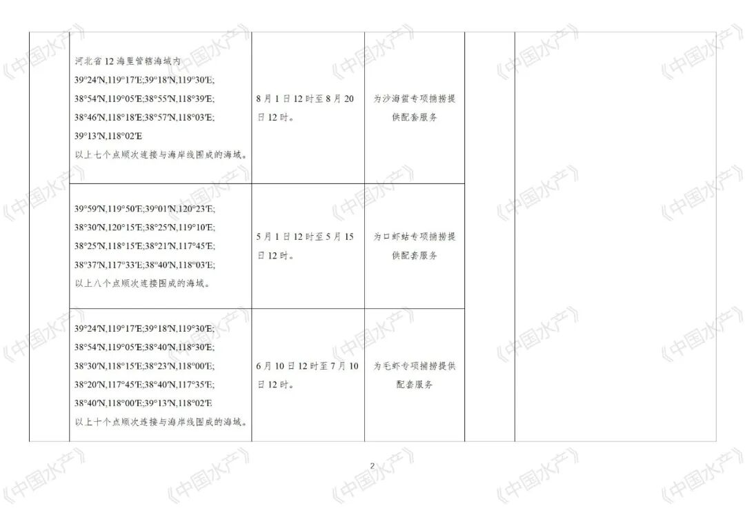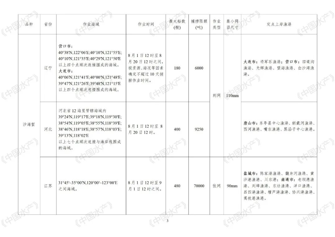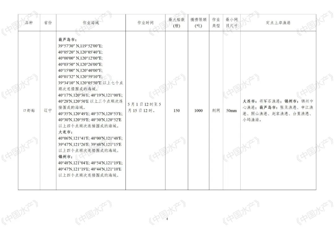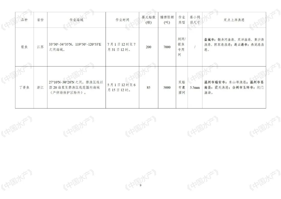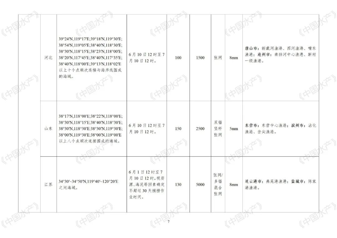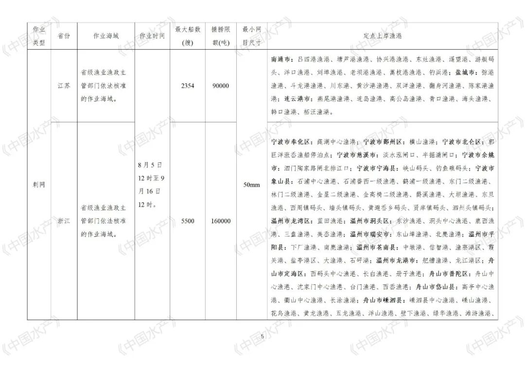 二、4种作业类型专项捕捞许可2025年伏季休渔期间许可北纬35度至北纬26度30分之间的黄海和东海海域桁杆拖虾、笼壶类、刺网和灯光围(敷)网4种作业类型渔船开展虾蟹类、中上层鱼类等资源专项捕捞。上述专项捕捞许可作业海域、作业时间、最大船数、捕捞限额、渔具最小网目尺寸和定点上岸渔港等详见附件2。